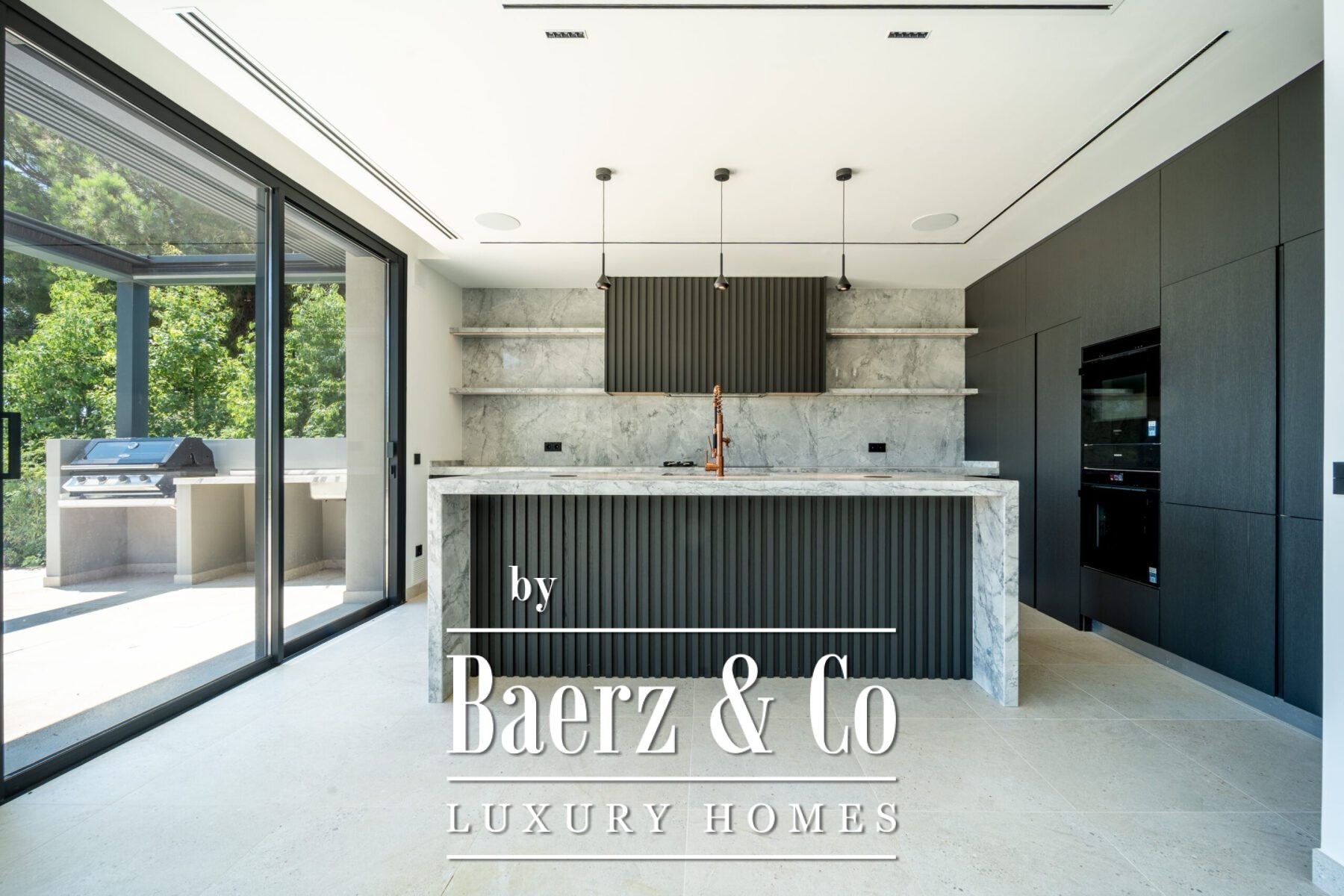 De begane grond biedt een lichte living en eetkamer met open indeling rondom een sfeervolle haard, direct verbonden met een Amerikaanse keuken voorzien van de nieuwste apparatuur. Een suite op deze verdieping biedt privacy voor gasten of als hoofdslaapkamer, aangevuld met een gastentoilet. Buiten vormen het verwarmde infinity-zwembad en een lounge met open haard en volledig uitgeruste zomerkeuken het intieme decor voor ontspannen avonden tussen weelderige mediterrane beplanting.