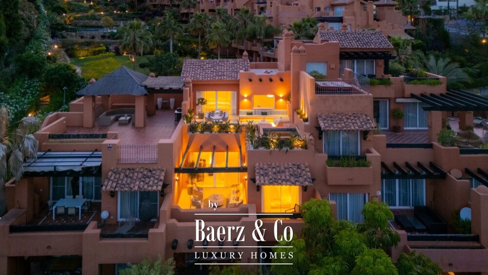 Het duplex penthouse in Marbella bevindt zich in een beveiligde residentie in Nueva Andalucía en biedt een discreet toevluchtsoord op enkele momenten van de Middellandse Zee. Deze recent gerenoveerde woning van 210 m² beschikt over vier slaapkamers en drie badkamers, waarbij hedendaagse architectuur wordt gecombineerd met hoogwaardige afwerkingen. Op de hoofdverdieping grenst een keuken uitgerust met Miele-apparatuur aan open woon- en eetruimtes, die leiden naar een terras met een fraai uitzicht op La Concha en de zee.