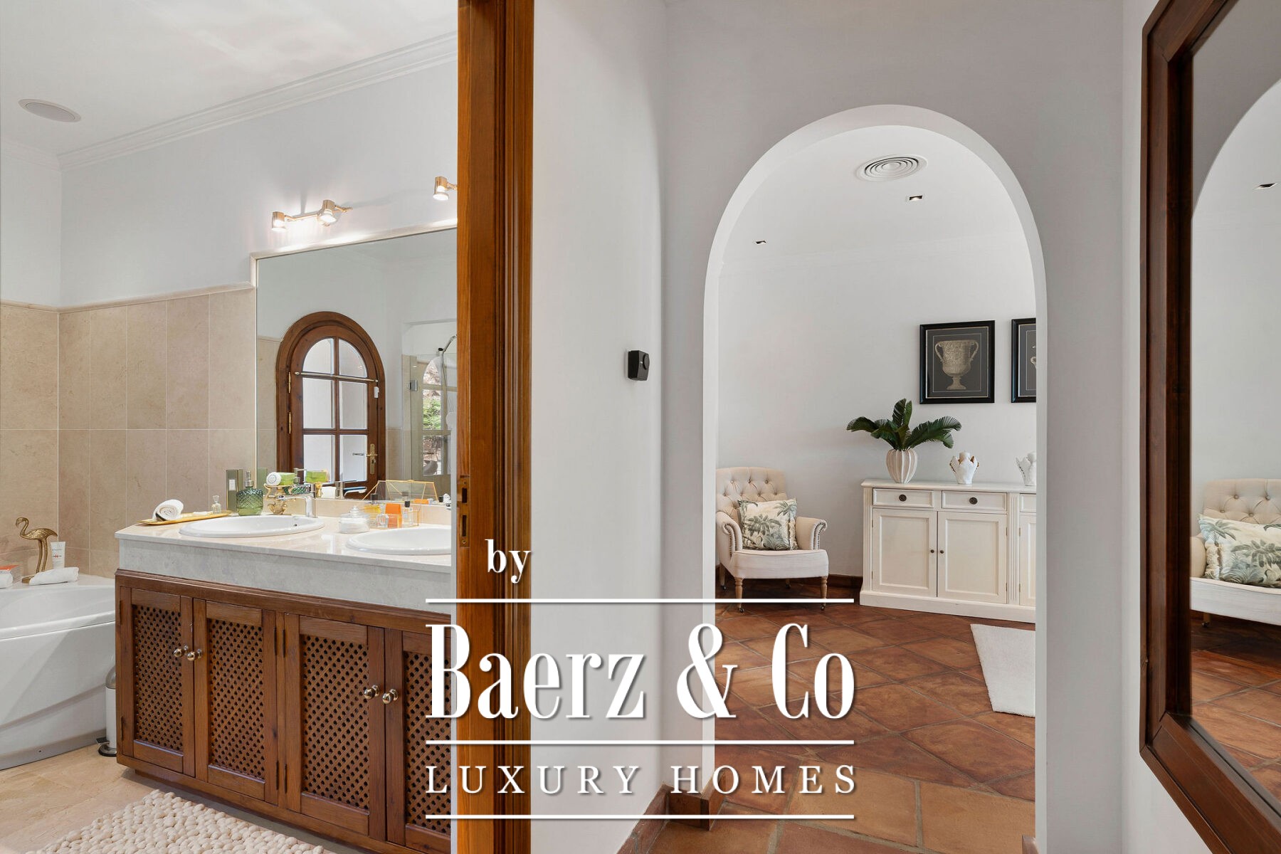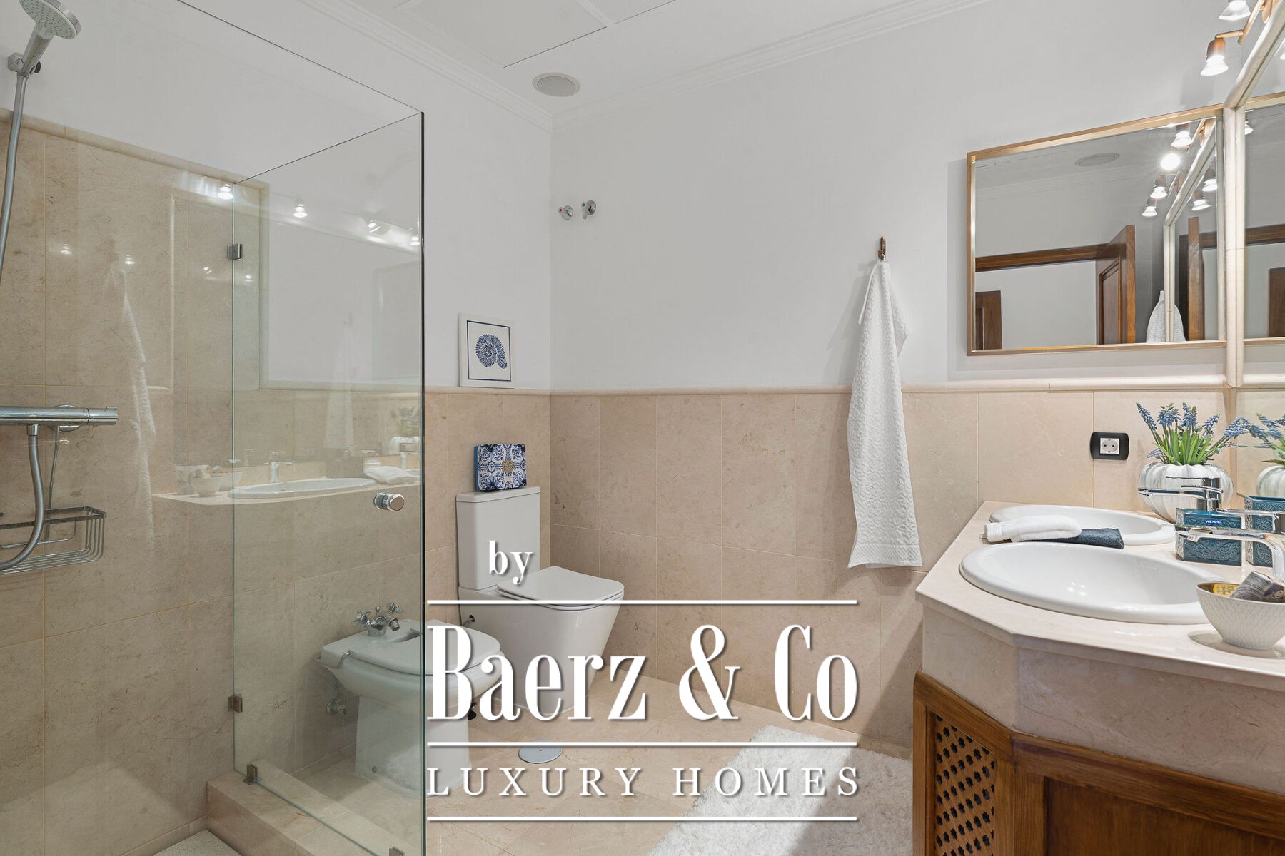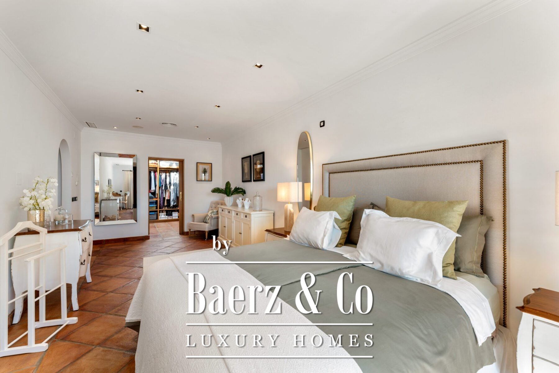 Het interieur ademt mediterrane elegantie, gekenmerkt door hoge plafonds, gracieuze bogen en open ruimtes die vloeiend overlopen van formeel naar informeel wonen. De vier slaapkamers en vier badkamers zijn zo gesitueerd dat privacy en comfort samengaan, terwijl de master suite beschikt over een inloopkast. Vloerverwarming, airconditioning voor zowel warm als koud, en een geïntegreerd surround sound systeem waarborgen gemoedsrust en welzijn. Daarnaast biedt de privé bioscoopruimte en de TV-lounge ultieme flexibiliteit voor ontspanning of gezelschap.