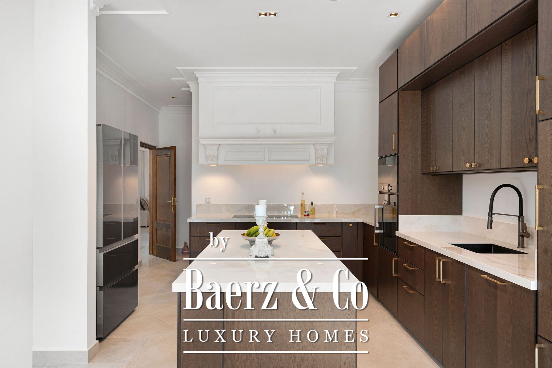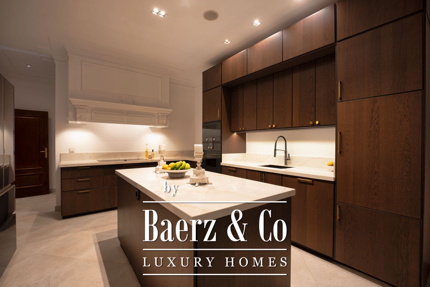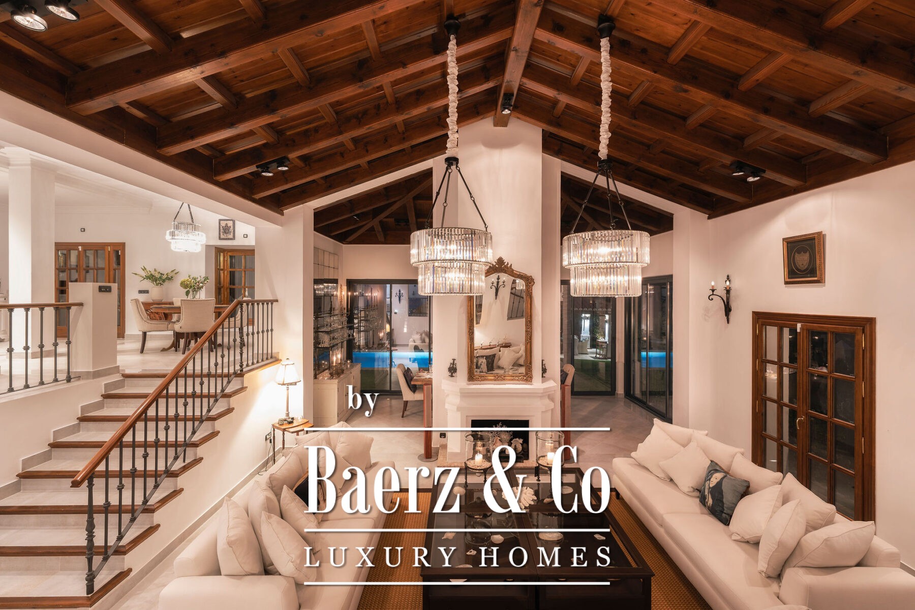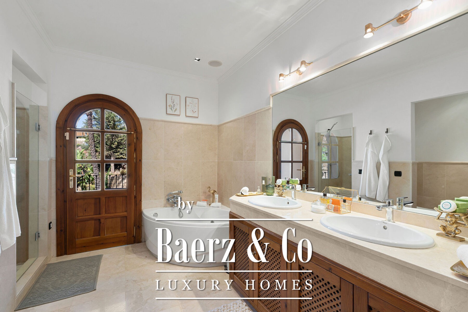 Het interieur ademt mediterrane elegantie, gekenmerkt door hoge plafonds, gracieuze bogen en open ruimtes die vloeiend overlopen van formeel naar informeel wonen. De vier slaapkamers en vier badkamers zijn zo gesitueerd dat privacy en comfort samengaan, terwijl de master suite beschikt over een inloopkast. Vloerverwarming, airconditioning voor zowel warm als koud, en een geïntegreerd surround sound systeem waarborgen gemoedsrust en welzijn. Daarnaast biedt de privé bioscoopruimte en de TV-lounge ultieme flexibiliteit voor ontspanning of gezelschap.