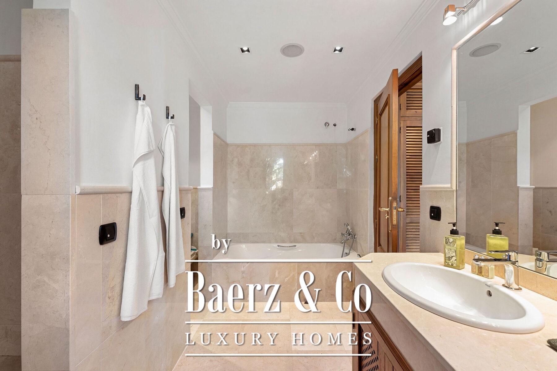 Buiten wordt de entree gemarkeerd door vijfentwintig volwassen palmbomen, omringd door volgroeide mediterrane tuinen met jacaranda’s, sinaasappel- en citroenbomen. Het privézwembad is naadloos geïntegreerd en nodigt uit tot zowel ontspanning als spektakel. Residenten genieten van volledige beveiliging, alarmsystemen en permanente bewaking binnen het afgesloten domein. De nabijheid van golfbanen, de voorzieningen van Marbella en de stranden van de Costa del Sol zorgen voor een moeiteloze verbinding tussen privacy en levensstijl. Deze villa is een toevluchtsoord én een blijvende investering, waarbij El Madroñal absolute discretie en een subliem uitzicht biedt.