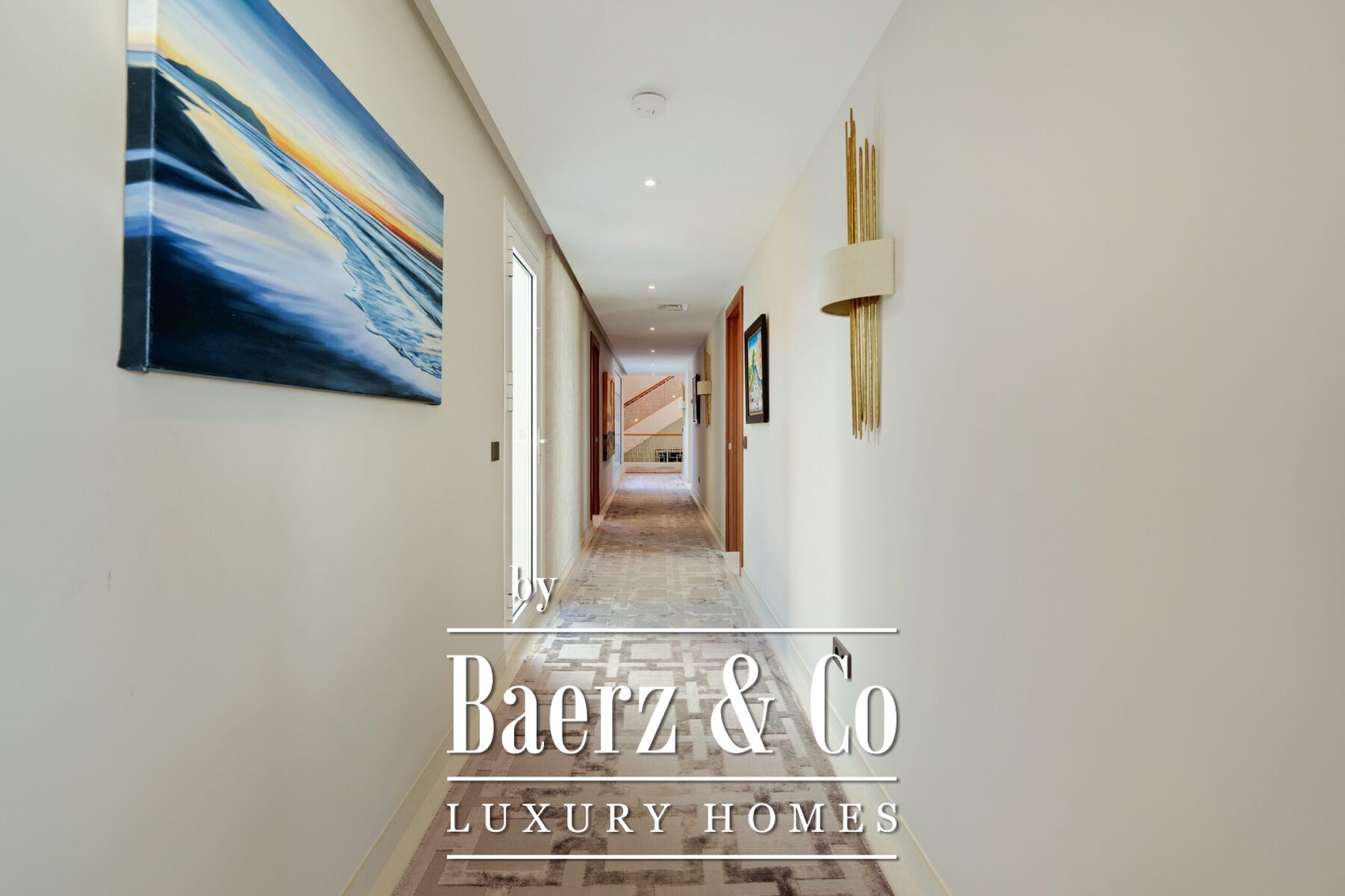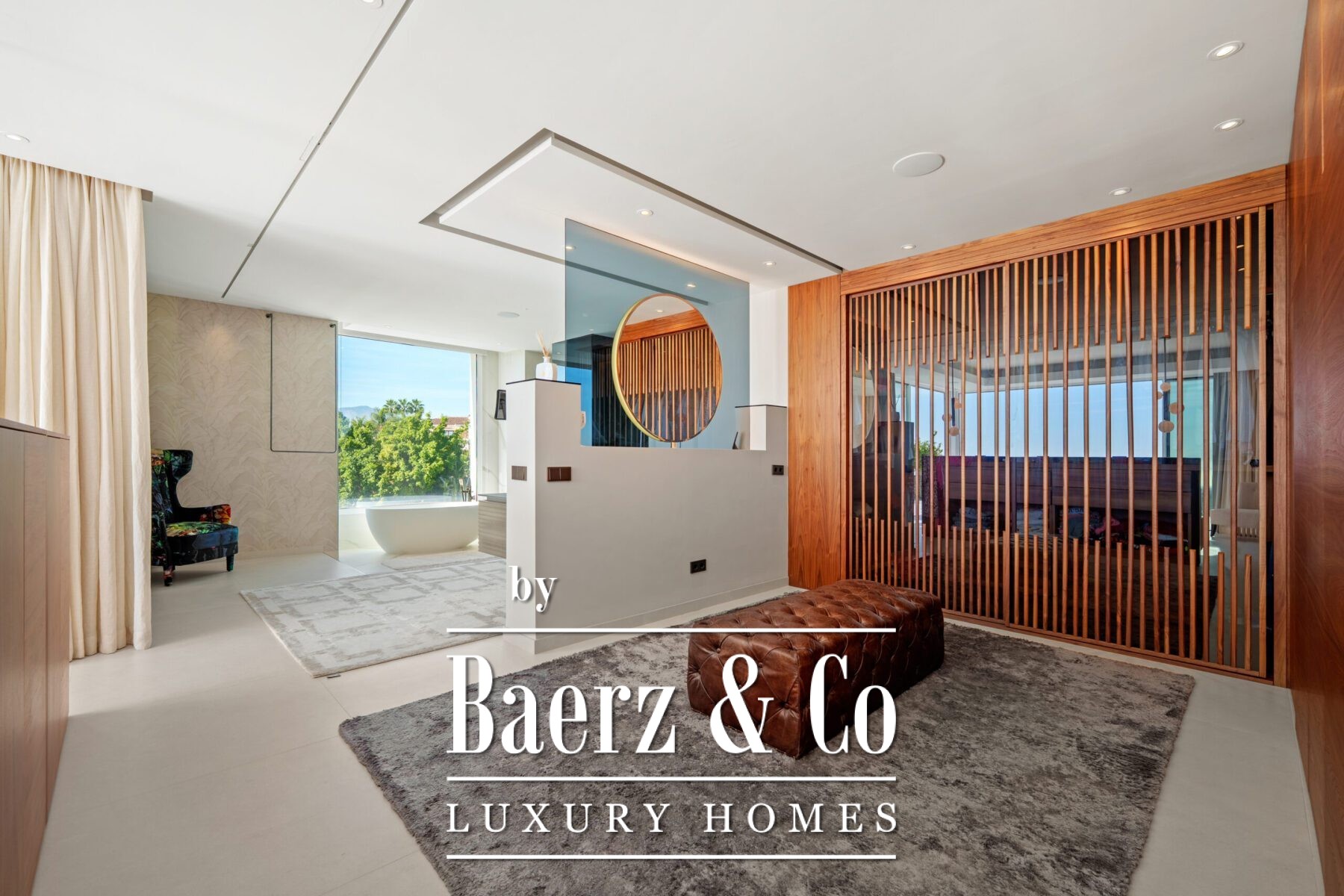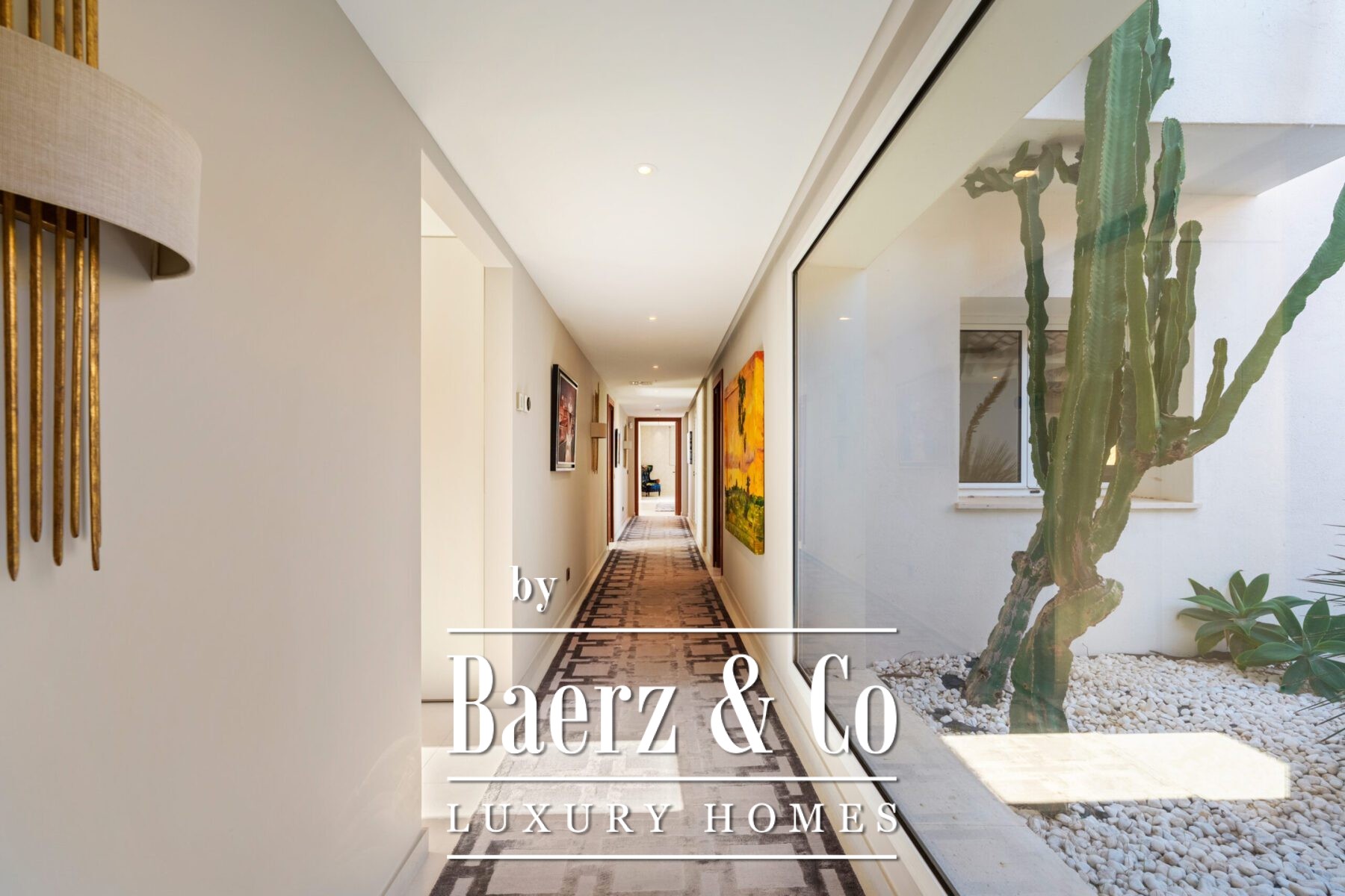 De hoofdresidentie en het onafhankelijke gastenverblijf bieden samen negen slaapkamers en negen en-suite badkamers, waarmee familie en gasten optimaal worden verwelkomd met comfort en heldere scheiding. De architectonische cadans loopt van royale binnenruimtes naar 140 m² terrassen, die een vloeiende verbinding creëren met de aangelegde tuinen en twee privézwembaden. De entree is discreet via een privé-oprit met overdekte parkeergelegenheid voor achttien voertuigen.