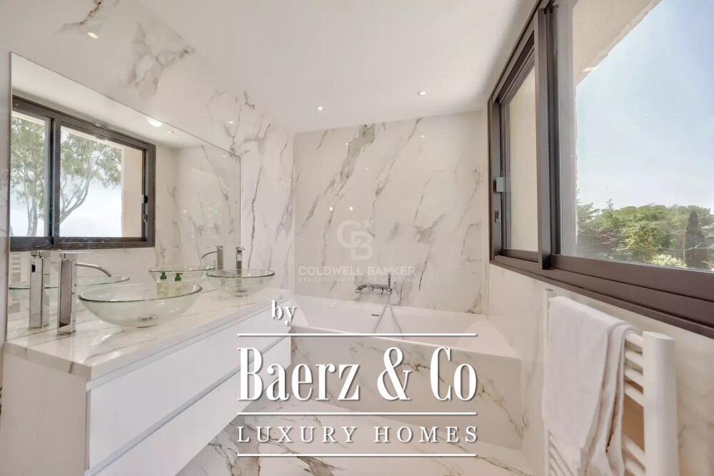 Villa Mougins met zeezicht is een eigentijds pand met 372 m² verfijnde leefruimte, rustig gelegen op een perceel van 2.137 m². Voltooid in 2021, biedt deze villa zes slaapkamers en zes badkamers, elk voorzien van vloerverwarming, in een opzet die zowel privacy als verbondenheid bevordert. De zuidelijke oriëntatie zorgt voor een constante lichtinval in het interieur en geeft toegang tot drie terrassen, die uitnodigen tot ontspannen mediterrane dagen en een onbelemmerd uitzicht over zee.