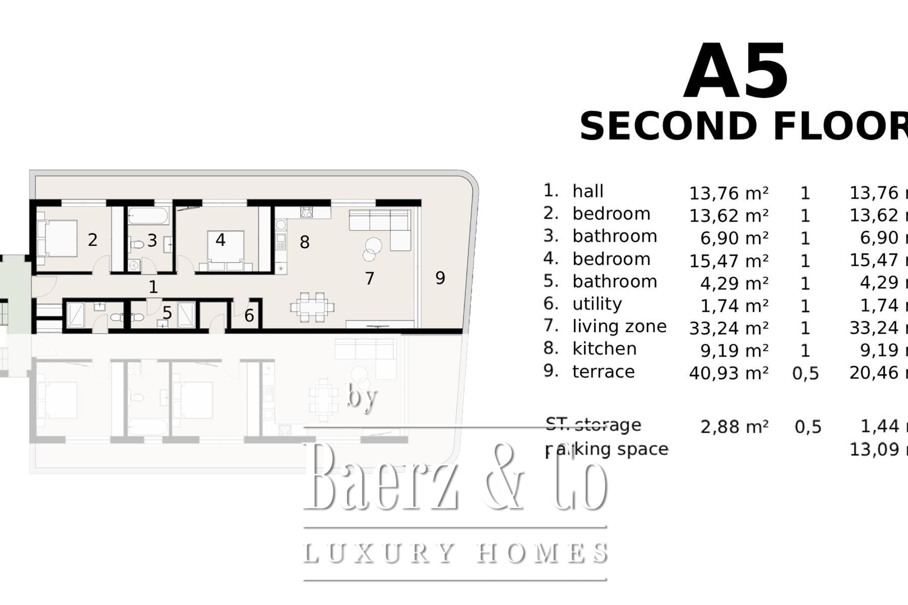 De open woonkamer loopt vloeiend over in de keuken en eetruimte, met directe toegang tot een ruim terras van 40,93 m² en een weids uitzicht over zee. Twee ruime slaapkamers en twee moderne badkamers worden gecompleteerd door functionele elementen zoals een entree, berging en twee parkeerplaatsen in de ondergelegen parkeergarage.