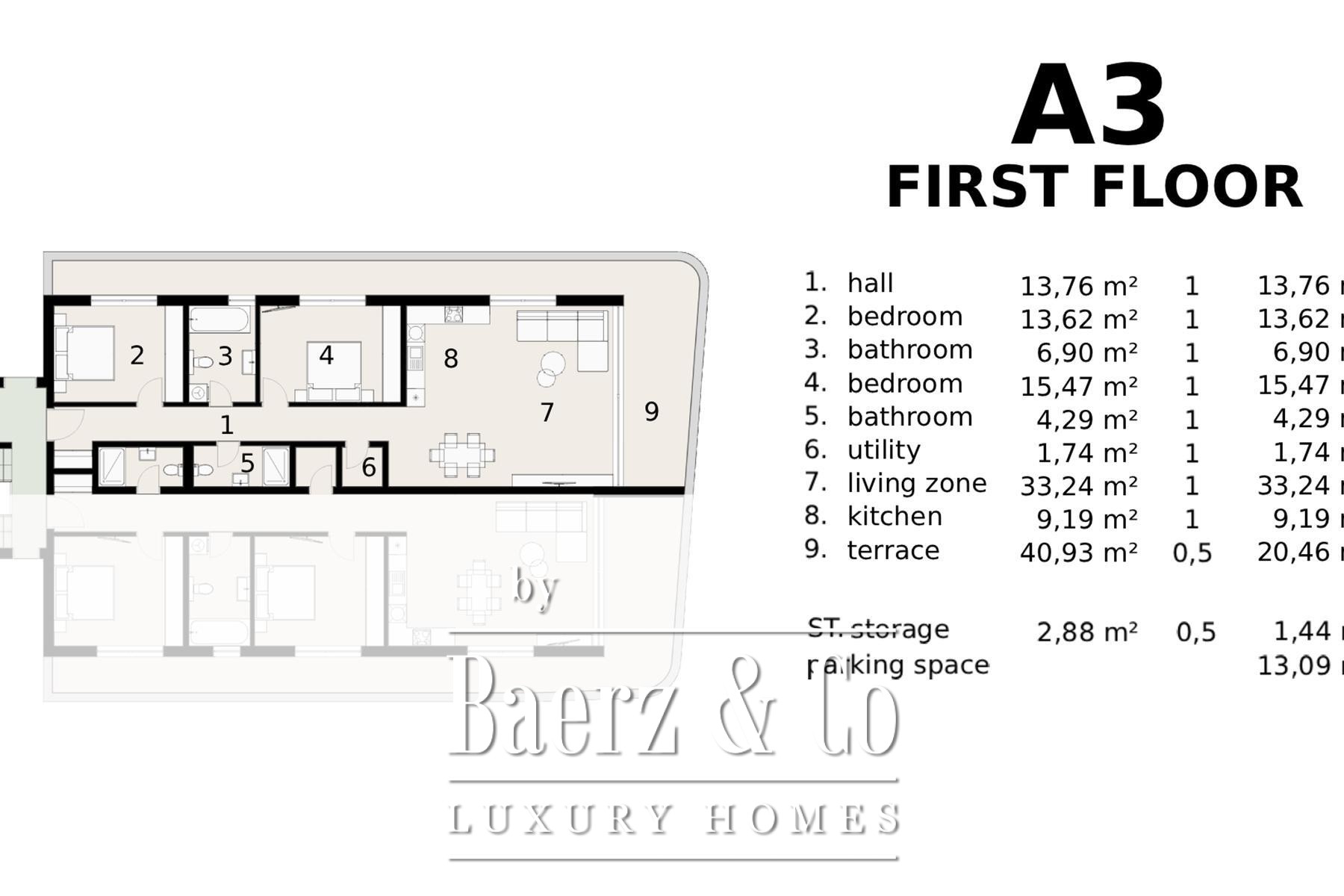 Appartement A3 beslaat een totale oppervlakte van 120 m², met een doordacht ingedeelde binnenruimte van 98,21 m² gericht op comfort en functionaliteit. De indeling omvat een entreehal, berging, twee ruime slaapkamers en twee moderne badkamers. De open woonzone verbindt keuken en eetgedeelte en loopt naadloos over in een royaal terras van 40,93 m² met een betoverend uitzicht op zee.