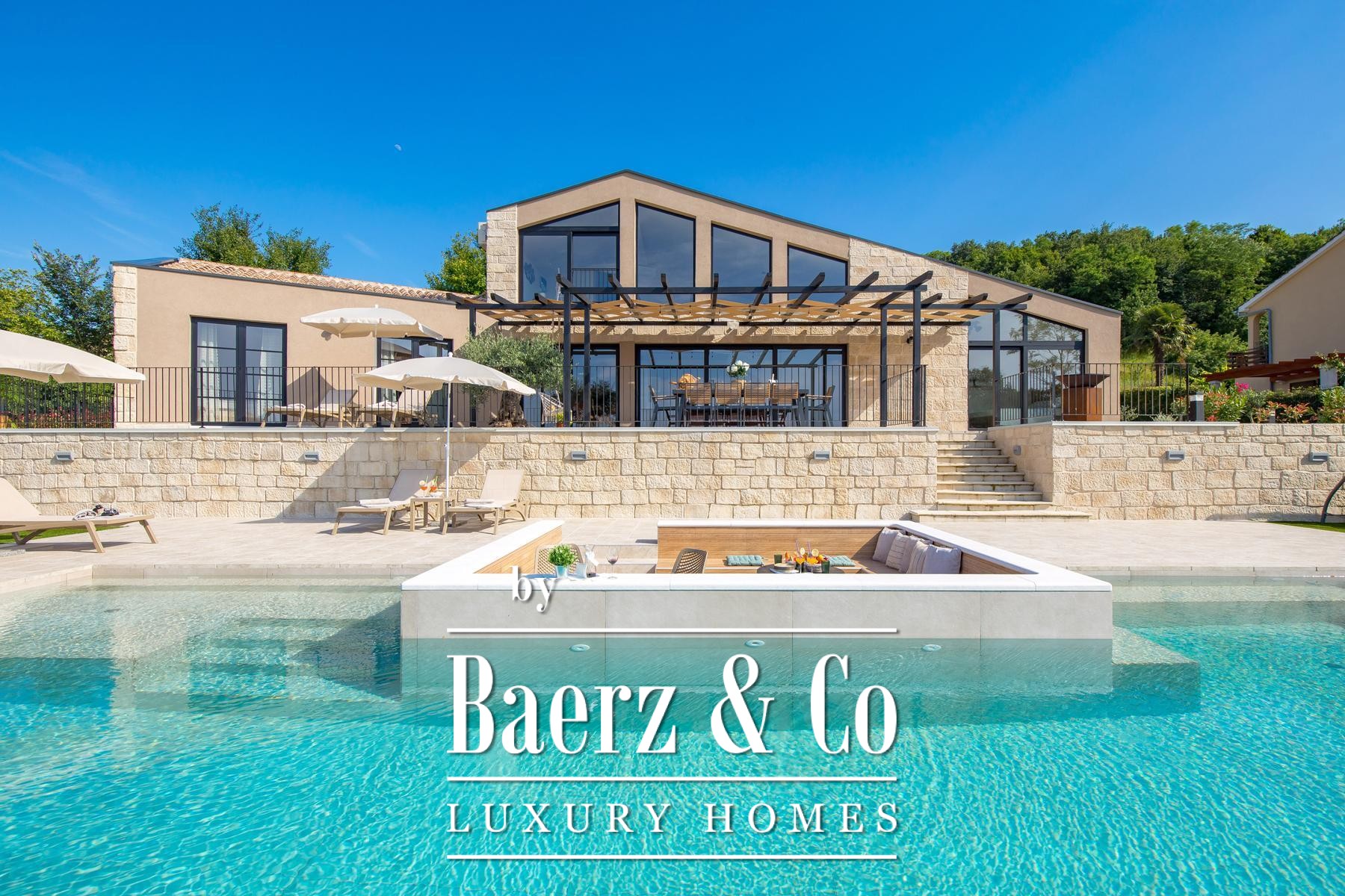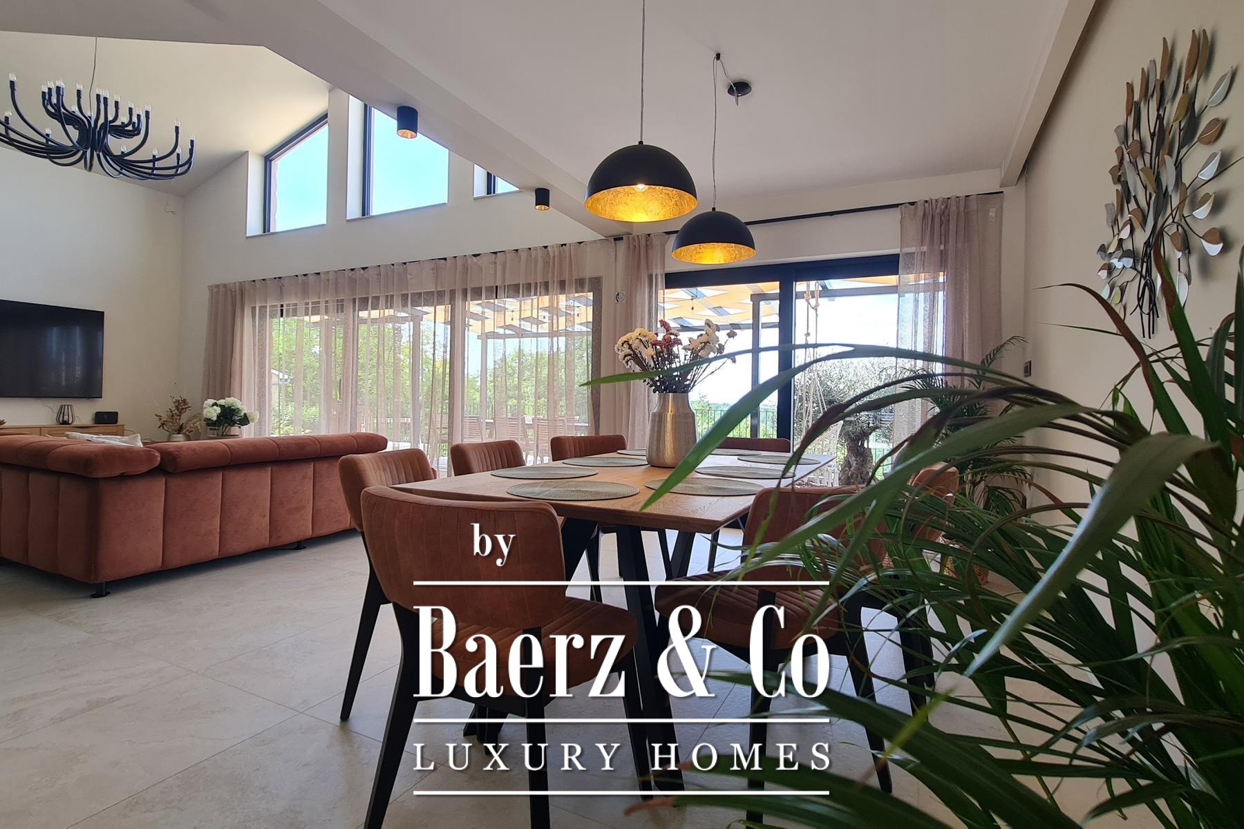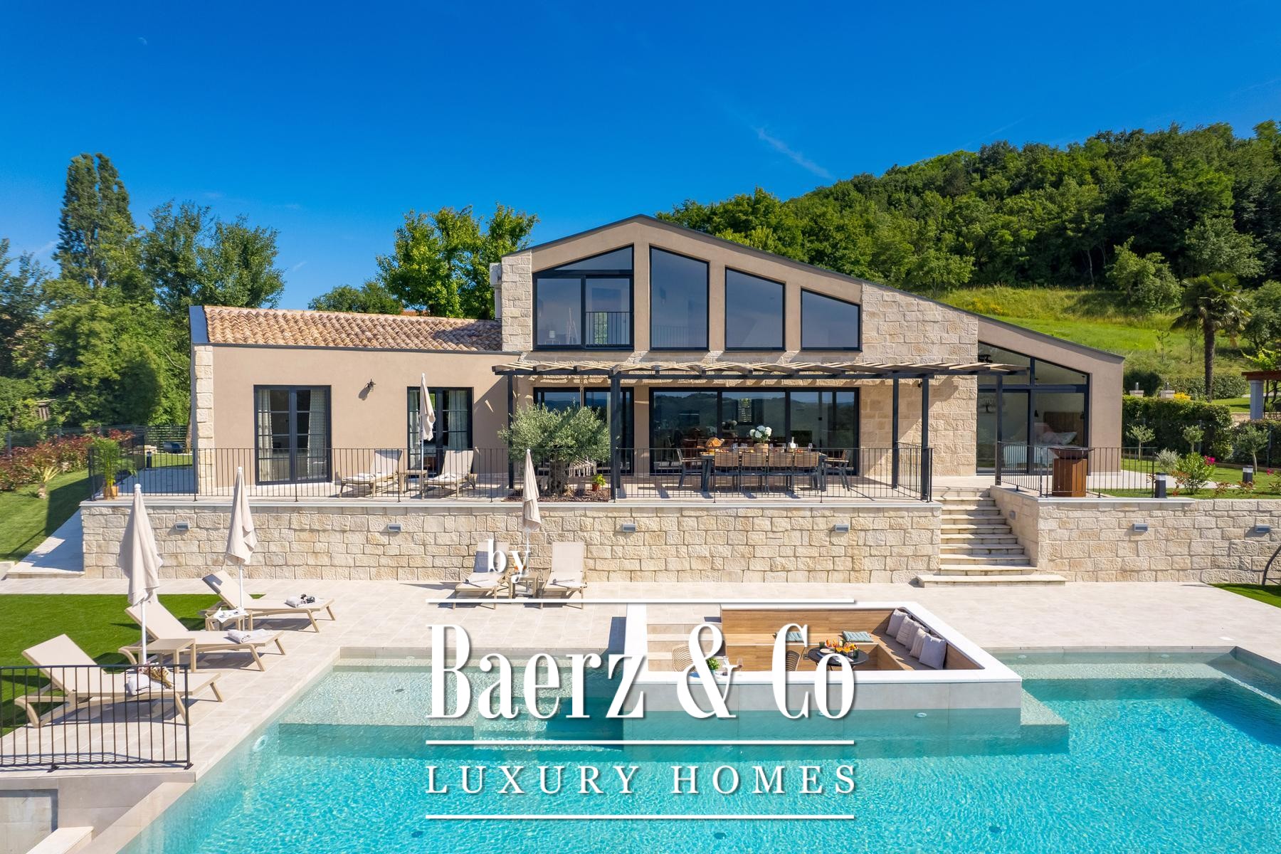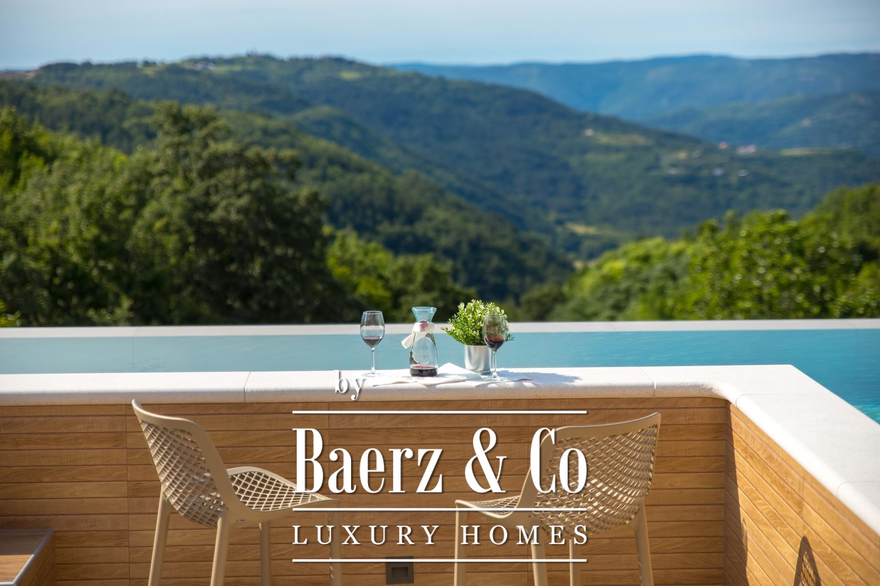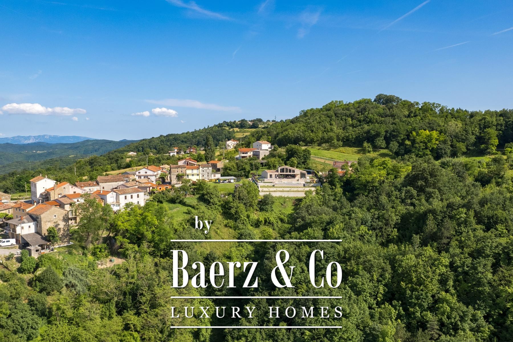 Luxe villa Pazin Okolica biedt 230 m² eigentijdse leefruimte, gelegen op een omheind perceel van 1.420 m² te midden van de zacht glooiende heuvels van Istrië. Het eigendom trakteert op weidse panoramische vergezichten, van het weelderige landschap tot aan Slovenië en Italië, en biedt het zeldzame gevoel van vrijheid en beslotenheid dat kenmerkend is voor de regio.