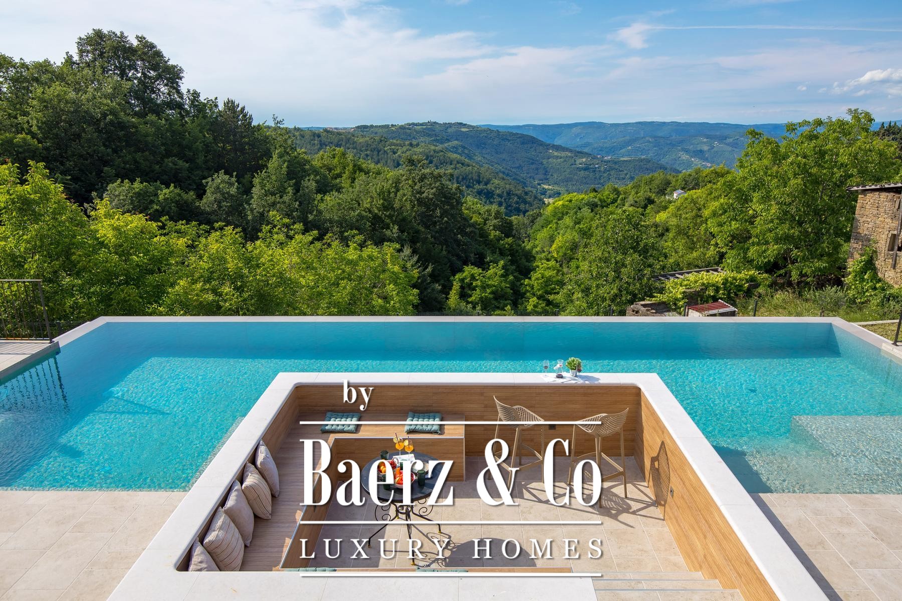 Buiten vindt u een driezijdig infinity zwembad, ontspanningsruimtes en zorgvuldig aangelegde tuin voor maximale privacy en rust. Vloerverwarming, acht airconditioningunits en een houtgestookte open haard zorgen voor comfort in elk seizoen. Overdekte parkeerplaatsen voor drie auto's maken het geheel compleet. Deze villa verenigt luxe, authenticiteit en de stille grandeur van Istrië. Deze luxe villa te koop in Pazin Okolica is uitermate geschikt als privéterugtrekking of voor een discrete investering.