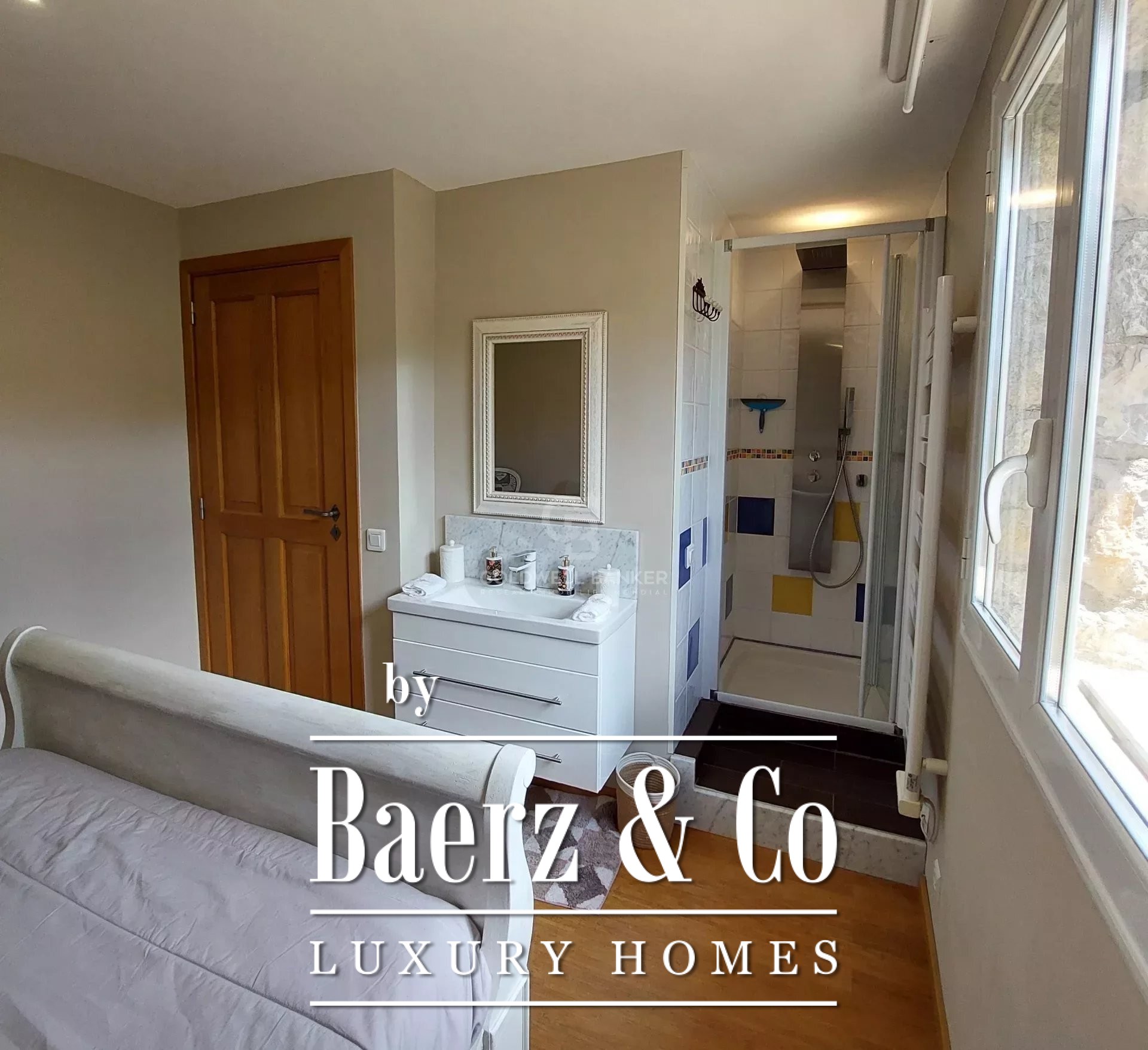 Binnen ontvouwt de begane grond zich met een eetkamer rond een open haard met geïntegreerde Godin-haard, een volledig uitgeruste keuken en twee slaapkamers, waaronder een en suite. Massief eiken deuren, dubbele beglazing en geïsoleerde wit aluminium schuiframen onderstrepen de hoogwaardige afwerking. Via de mezzanine-studeerkamer op de eerste verdieping is een extra slaapkamer met dakterras bereikbaar, terwijl een privé, volledig geconditioneerd appartement van 42 m² op tuinniveau onafhankelijke woonruimte biedt met woonkamer, keuken, slaapkamer, cabine en terras; ideaal te gebruiken als verhuur of gastverblijf.