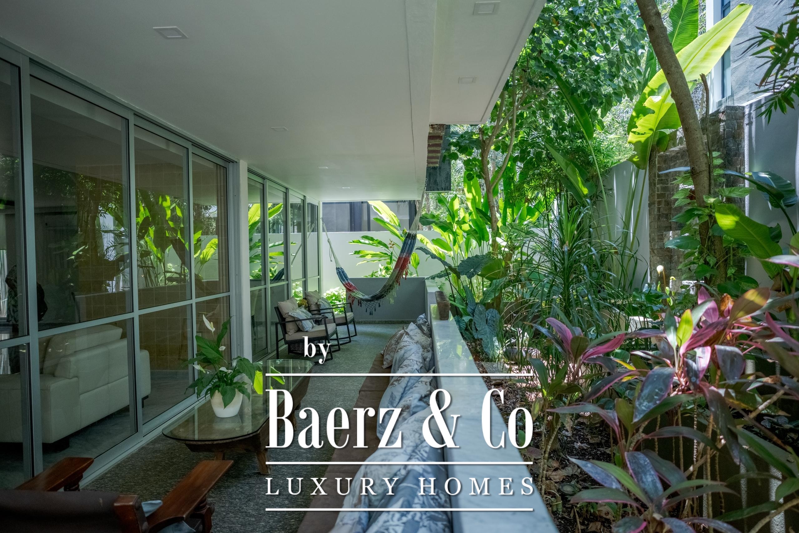 En planta baja, disfruta de una sala-comedor amplia con ventanales corredizos que se abren completamente hacia una terraza integrada con un hermoso jardín tropical, creando un ambiente ideal para el descanso o la convivencia. La cocina equipada cuenta con barra integrada al comedor, cubierta de granito negro y carpintería en madera, perfecta para quienes aman cocinar o recibir invitados.