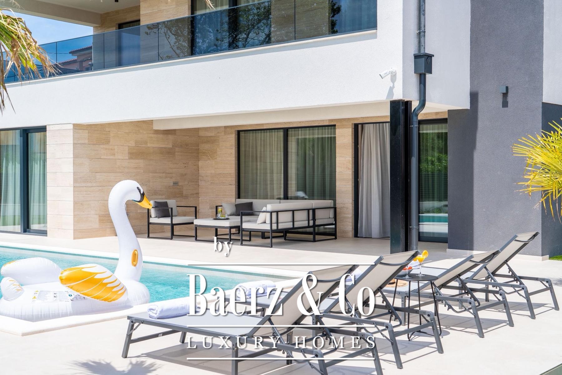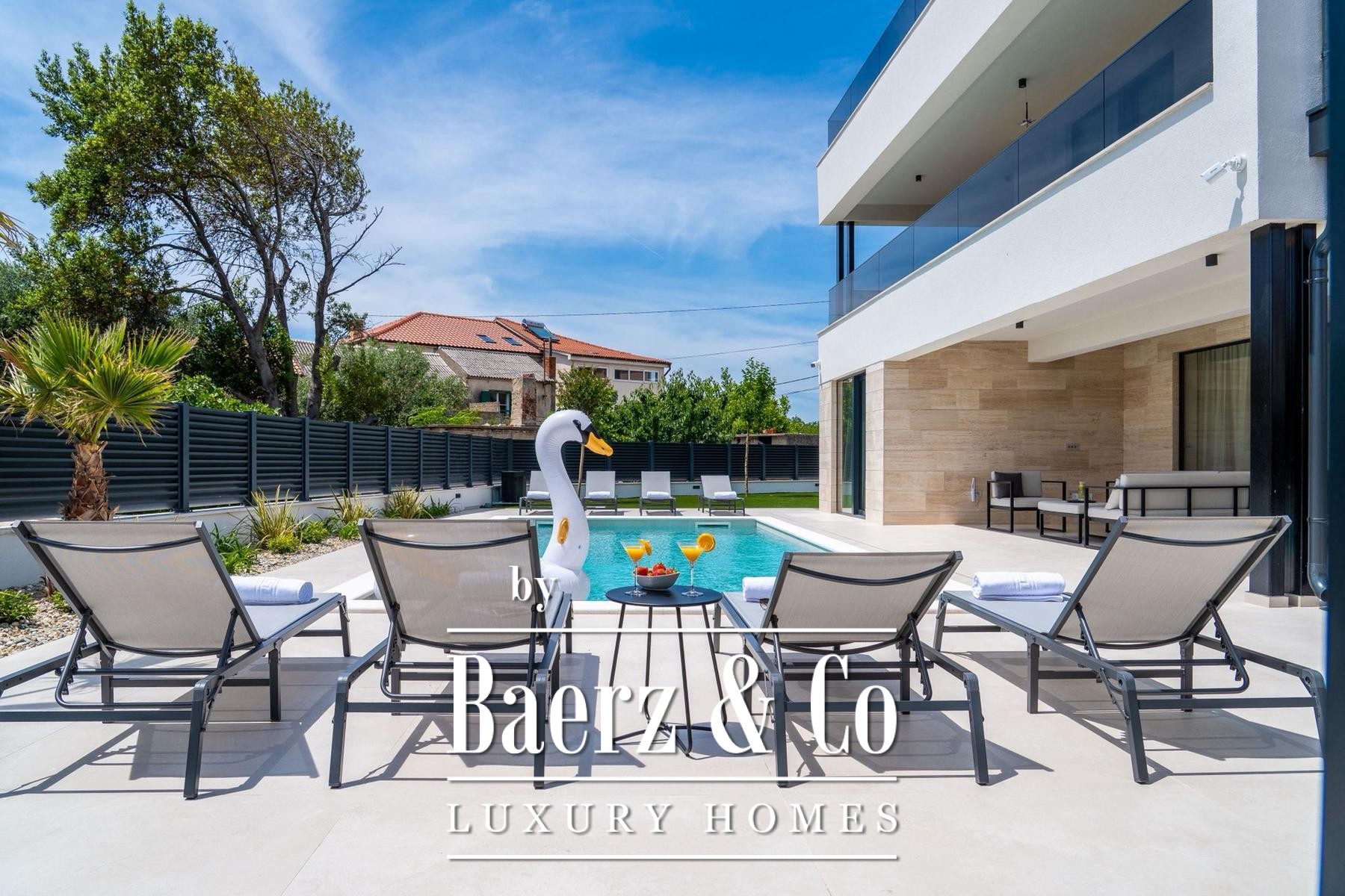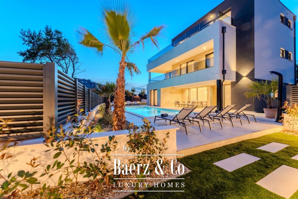 Overdekte en open terrassen vergroten de leefruimte, waar zon en schaduw harmonieus samenkomen. De fraai aangelegde tuin en zonneweide geven privacy, terwijl beveiligde parkeergelegenheid met cameratoezicht extra zekerheid biedt. Op slechts enkele passen van uitstekend onderhouden stranden combineert deze villa te koop in Privlaka architectonische elegantie met mediterrane ontspanning, geschikt als discrete gezinswoning of luxe vakantiewoning. Elk architectonisch detail staat garant voor functionaliteit en duurzame kwaliteit en creëert een sfeer van rust, comfort en licht.