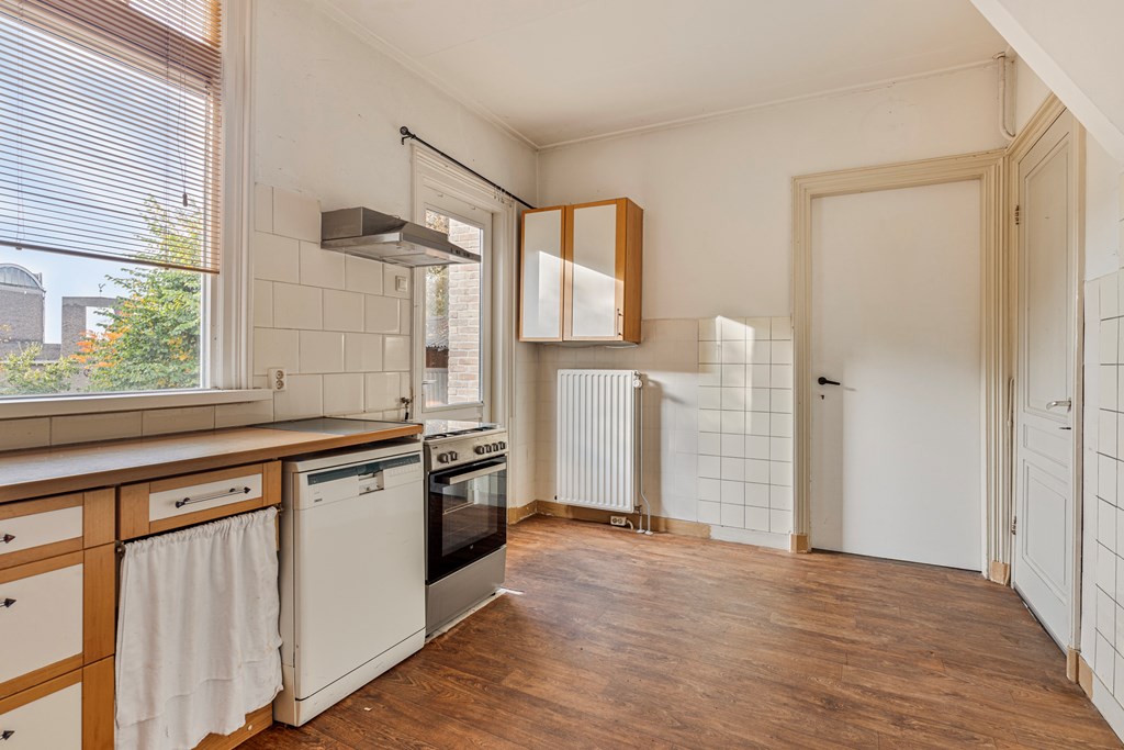 Aansluitend aan de hal bevindt zich de afgesloten keuken, voorzien van een praktisch L-vormig aanrechtblad. Hier vindt u een ingebouwde oven en gasfornuis, maar de ruimte leent zich perfect voor een volledige renovatie. Met de beschikbare ruimte kunt u hier een moderne keuken realiseren, geheel naar eigen smaak. Vanuit de keuken heeft u directe toegang tot de kantoorruimte op de begane grond en de riante achtertuin. Eventueel kan de kantoorruimte ook benut worden als aparte eetkamer.