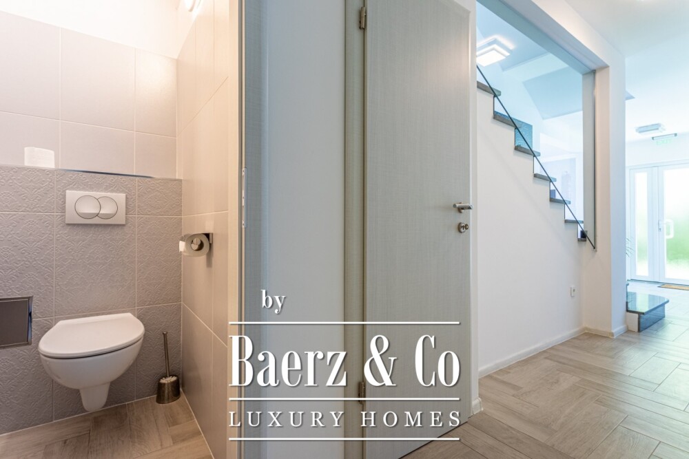 De drie fraai ontworpen woonlagen zorgen voor een harmonieuze en royale leefbeleving. Op de begane grond staat het moderne woongedeelte centraal, waar keuken en eetkamer naadloos samengaan met twee slaapkamers met eigen badkamer, een gastentoilet en een aparte wasruimte. Hoge glazen deuren openen naar het buitenterras, omringd door doordachte beplanting en een rustige sfeer voor het dagelijks leven.