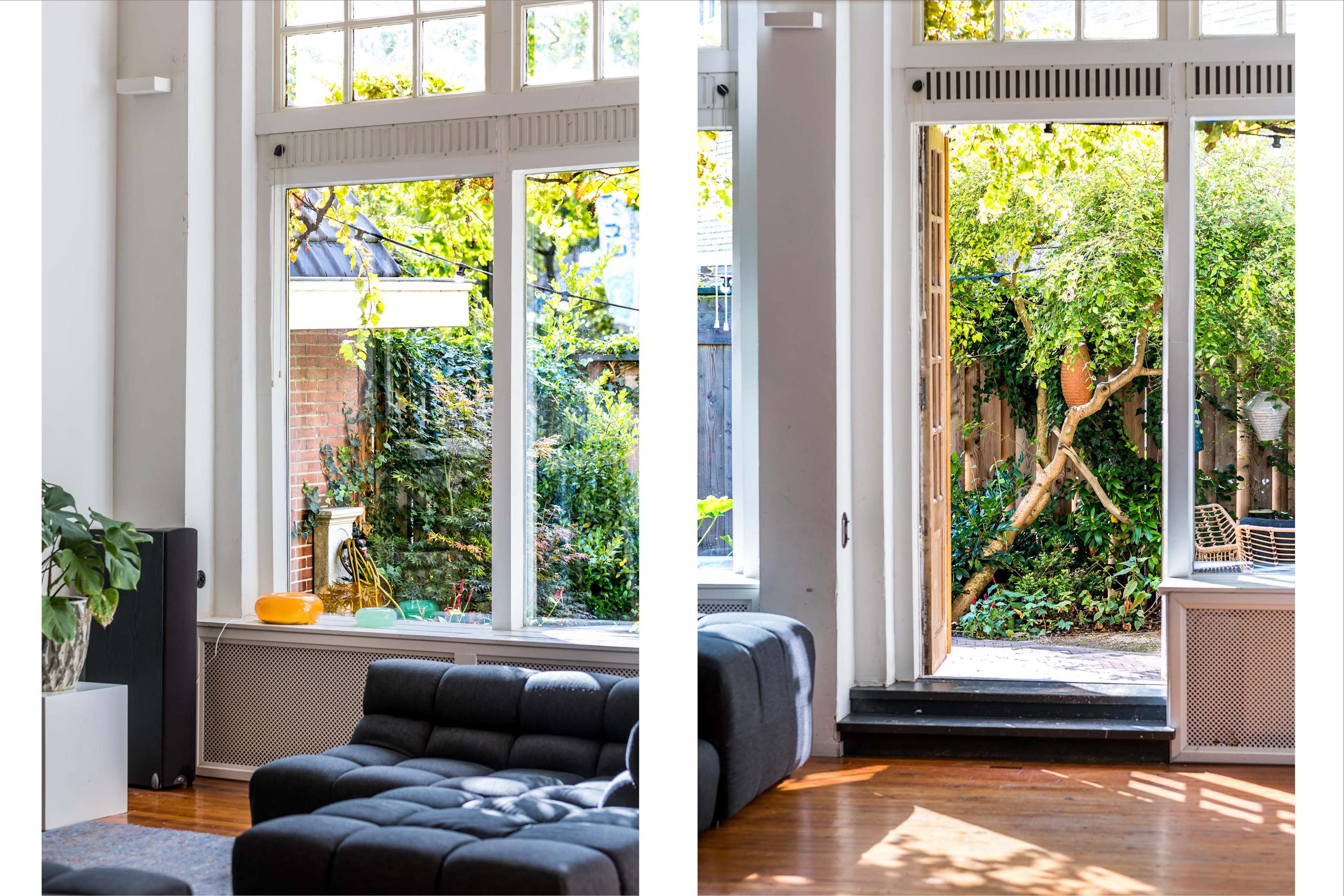 Aan de voorzijde ligt een groene, besloten tuin waar u in de ochtend- en middagzon kunt genieten van rust en privacy. Via een poort is er toegang tot het aangrenzende schoolplein, dat door de bewoners gebruikt mag worden als speelplek voor kinderen of voor gezellige borrels en barbecues met vrienden.