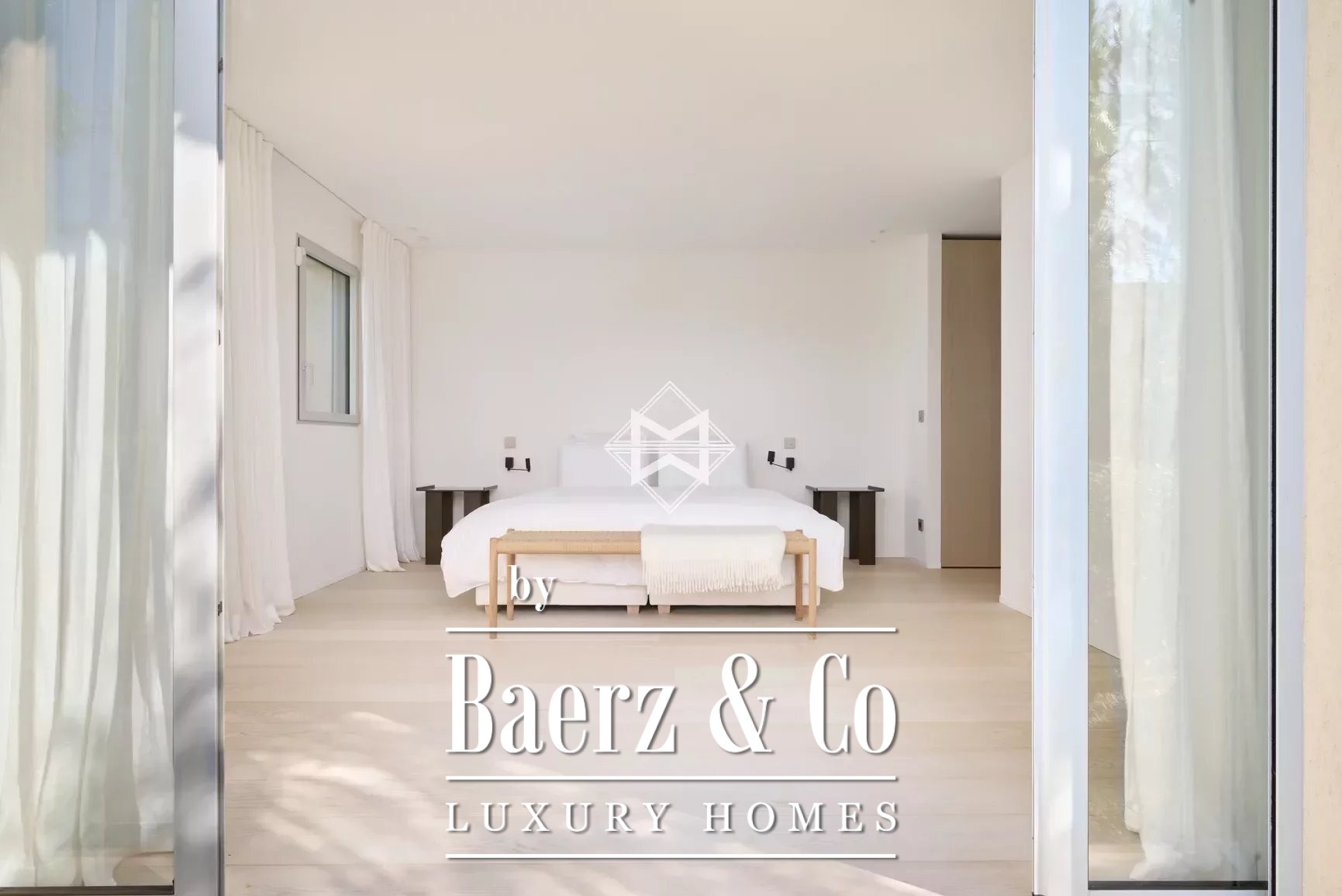 De villa is verdeeld over twee verdiepingen en een lichte souterrain en beschikt over acht slaapkamers, waaronder een master suite met privéterras, royale kleedruimte, badkamer en aparte douche. De leefruimtes op de begane grond lopen naadloos over van een salon met haard en een eetkamer naar een volledig uitgeruste keuken met bijkeuken. Ruime overdekte en open terrassen omlijsten het uitzicht op de tuin en zorgen voor een vloeiende overgang tussen binnen en zorgvuldig aangelegde buitenruimtes.