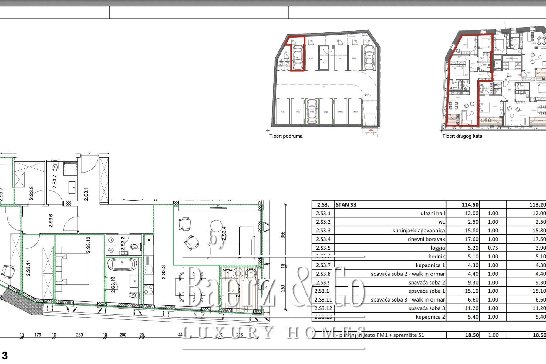 Binnen zorgt de ruimtelijke indeling voor een harmonieus samenspel van open woon-, keuken- en eetgedeeltes met een discrete loggia, drie slaapkamers en drie badkamers. Twee slaapkamers zijn voorzien van een inloopkast, waarvan één kamers met een en suite badkamer. Het totale afgesloten woonoppervlak bedraagt 115,7 m², wat zorgt voor een ruimtige en tegelijkertijd privé ambiance.