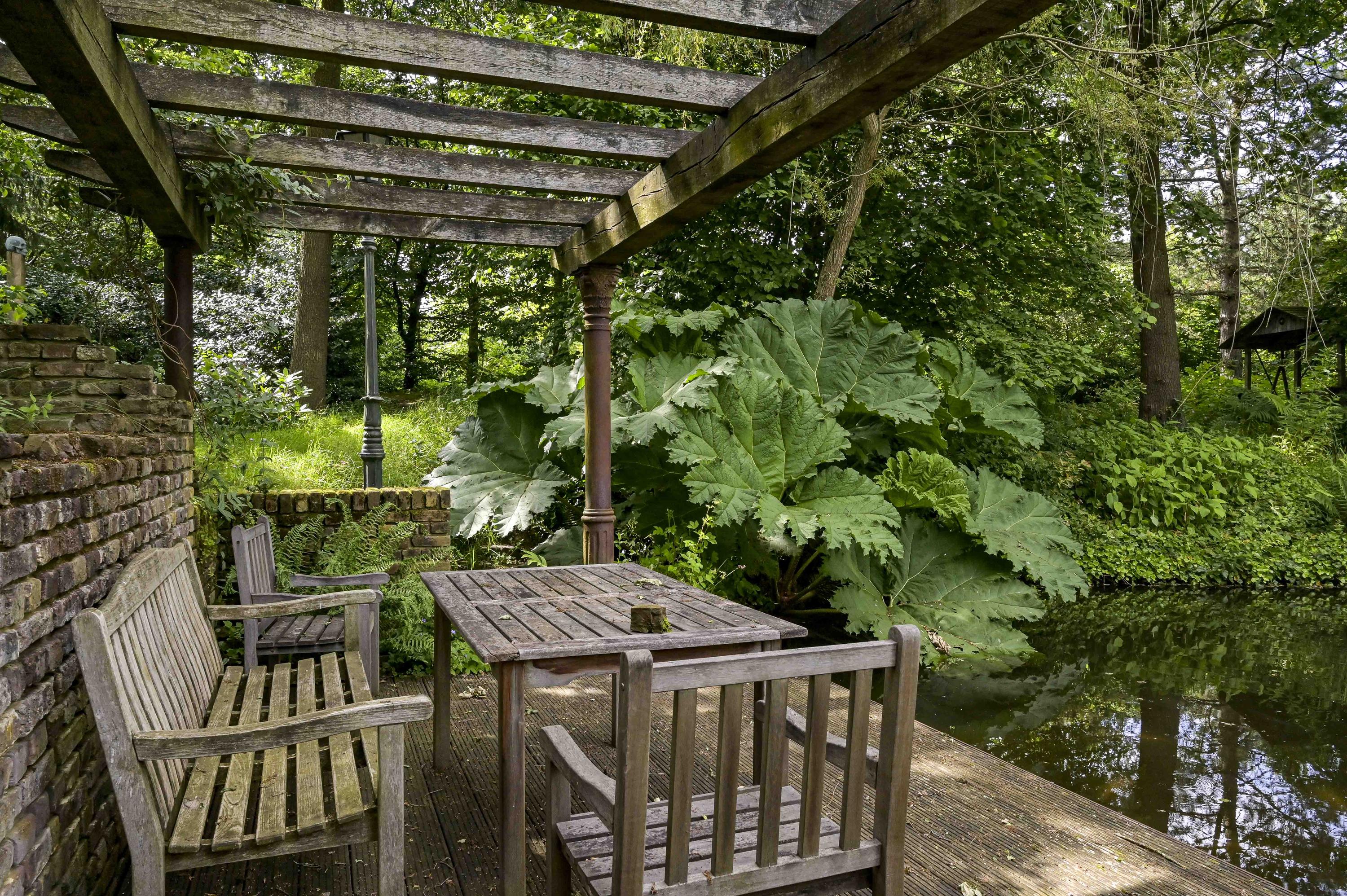Uniek perceel van 7616m² met zeer veel groen, een royale vijver en diverse wandelpaden. U kunt hier heerlijk in eigen bostuin wandelen en toch waant u zich ergens anders. Het geheel zorgt voor een unieke flora en fauna op het terrein. Op het gehele perceel is een beregeningssysteem aanwezig. Op de vlonder bij de vijver kunt u aan het water rustig genieten van een zomerse avond. De oprijlaan met elektrische poort leidt u naar de monumentale woning.