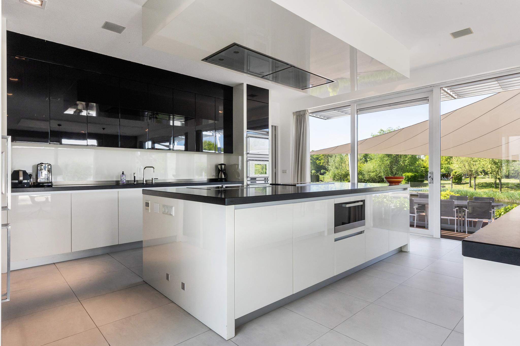 Rechts van de hal ligt de riante woonkeuken met drie schuifpuien naar de terrassen aan het water. De luxe keukenopstelling bestaat uit vier delen en is uitgevoerd met fronten in hoogglans wit en zwart met gezoet granieten werkbladen en luxe Gaggenau-inbouwapparatuur: dubbele kookplaten met afzuiging, ovens, koelkasten, vriezers, wijnklimaatkasten, warmhoudlade en vaatwasser. De grote leefruimte is ingericht met een eettafel voor 10 personen en een sfeervolle moderne gashaard. In deze leefkeuken staan licht, zicht en de verbinding met buiten centraal.