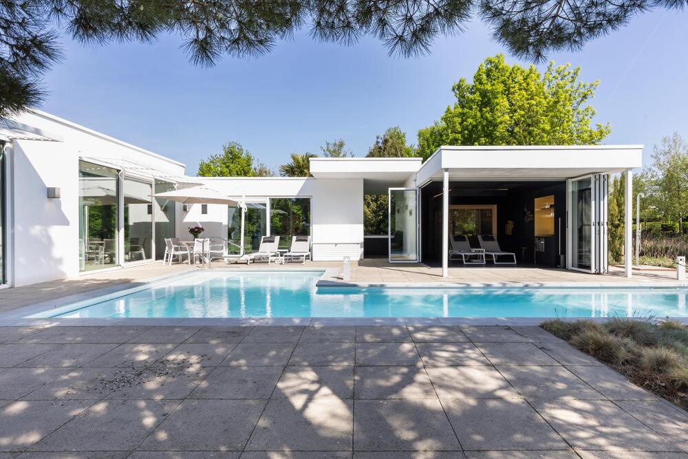 Het poolhouse vormt één architectonisch geheel met de woning en is aan twee zijden open te schuiven via glazen puien, waardoor het in de zomer een aangename veranda wordt. De binnenruimte is warm afgewerkt met donkere tinten en hoogwaardige materialen. De keukenopstelling beschikt over een vaatwasser, koelkast, wijnklimaatkast, spoelunit en opbergkasten. In het poolhouse bevindt zich tevens de luxe wellnessruimte, voorzien van een vierpersoons sauna met glazen wanden aan drie zijden. De sauna is zowel als infrarood- als traditionele sauna te gebruiken. Daarnaast zijn er een toilet, een inloopdouche en infrarood verwarmde ligbedden aanwezig. Naast het poolhouse bevindt zich een separate roestvrijstalen buitendouche met hand- en stortdouche. De technische installaties voor zwembad en sauna zijn weggewerkt in de berging aan de achterzijde.