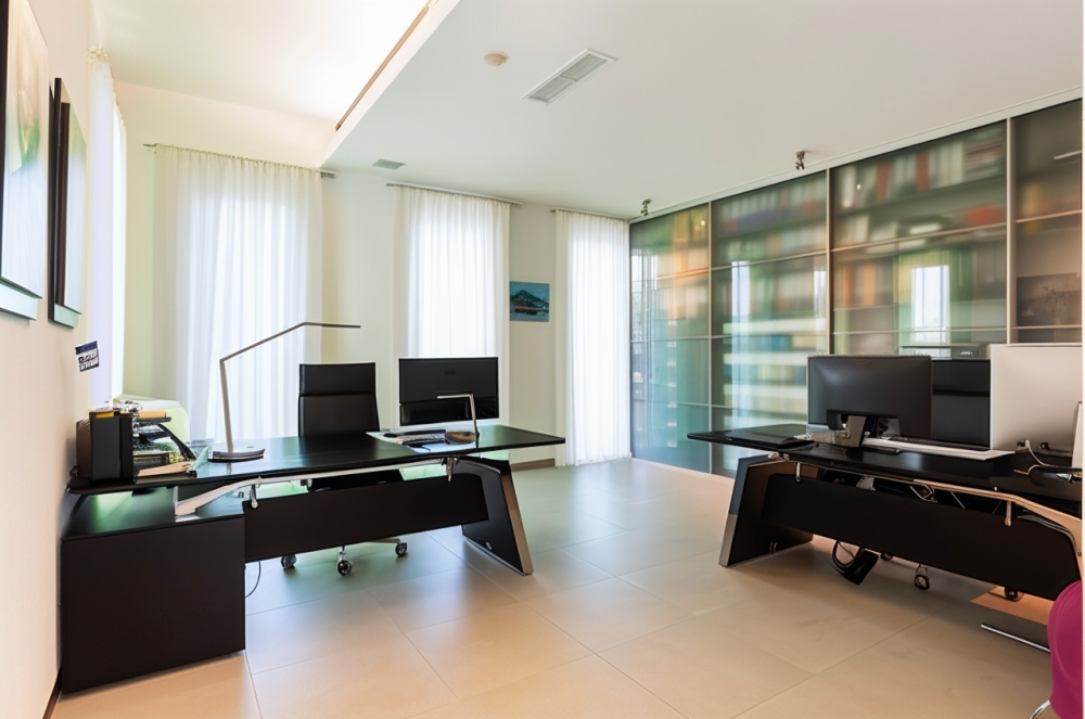 Aan de voorzijde van de woning bevindt zich een royale werkruimte met twee werkplekken en inbouwkasten. Aangrenzend aan de royale vergaderruimte met sfeer gashaard, hoge ramen met een schuifpui en uitzicht op het besloten terras met olijfbomen. Deze ruimte staat met een schuifdeur in verbinding met de centrale entree. Hierdoor is het eenvoudig om werk en privé te combineren, zonder concessies te hoeven doen aan comfort of representativiteit.