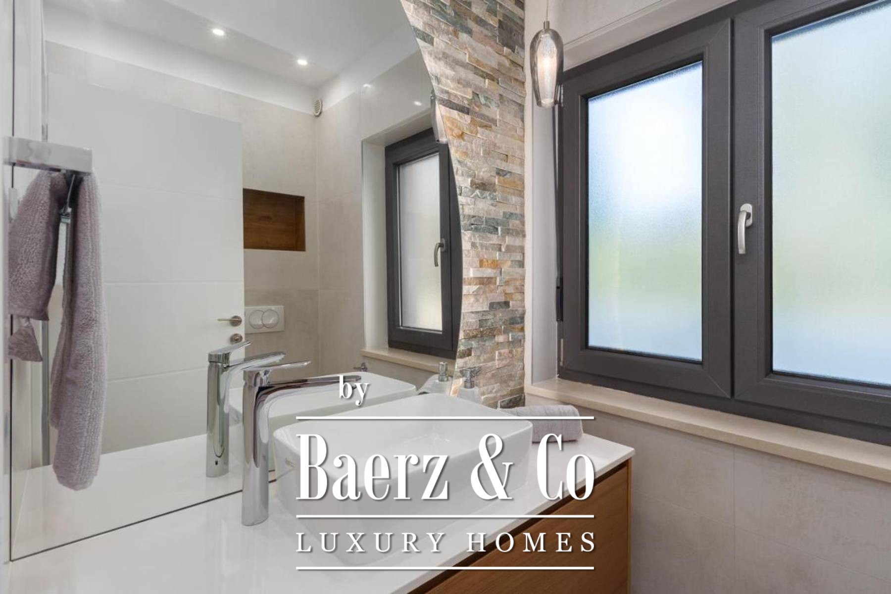 Op de eerste verdieping bevinden zich drie extra slaapkamers, waarvan twee met toegang tot een ruim terras, met zicht op zee en omliggend groen. Vloerverwarming, een warmtepompsysteem, automatische tuinirrigatie en een volledig alarmsysteem bieden extra gemoedsrust. Villa Tinjan ligt rustig op slechts 34 km van Aquapark Istralandia, 46 km van de Arena van Pula en 44 km van luchthaven Pula, waardoor het rustige wonen wordt verbonden met de gerenommeerde voorzieningen van Istrië. Wie op zoek is naar een luxe villa te koop in Tinjan vindt hier sereniteit en moderne verfijning gecombineerd.