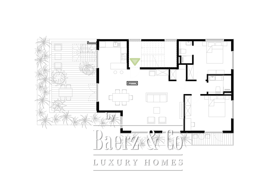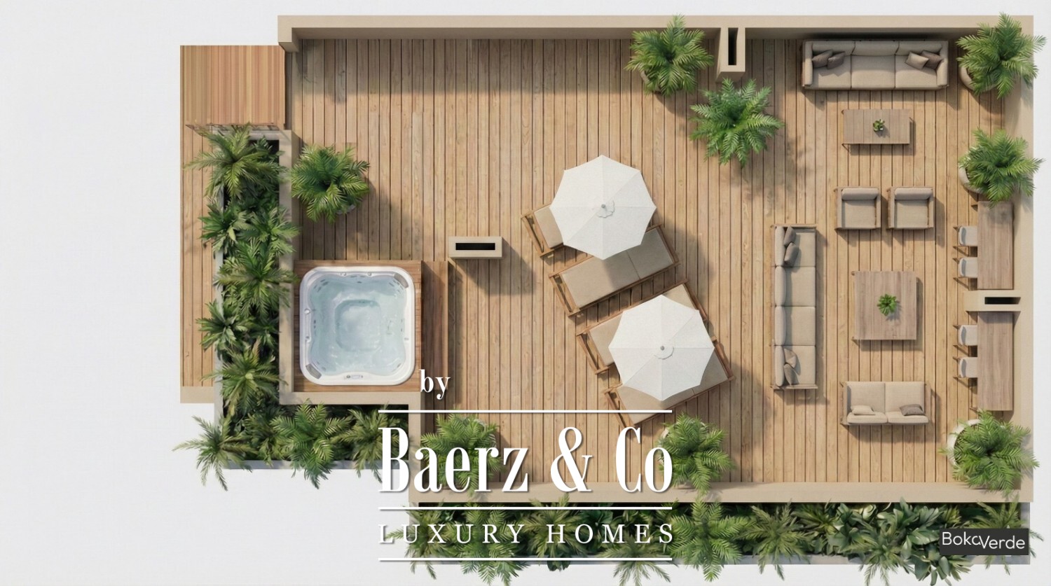 De woning maakt deel uit van een nieuw gerealiseerd project met negen laagbouwcomplexen en combineert een intieme sfeer met doordachte architectuur. Het appartement heeft een oppervlakte van 122,38 m² met twee slaapkamers, een badkamer, een gastentoilet en een lichte woonkamer die uitkomt op een royaal terras. Boven is er een privé dakterras van 99,92 m², met een weids uitzicht over de baai en de omliggende bergen, ideaal voor rustige momenten of stijlvol vermaak. De overgang tussen binnen en buiten is naadloos, bepaald door natuurlijk licht en de texturen van het landschap.