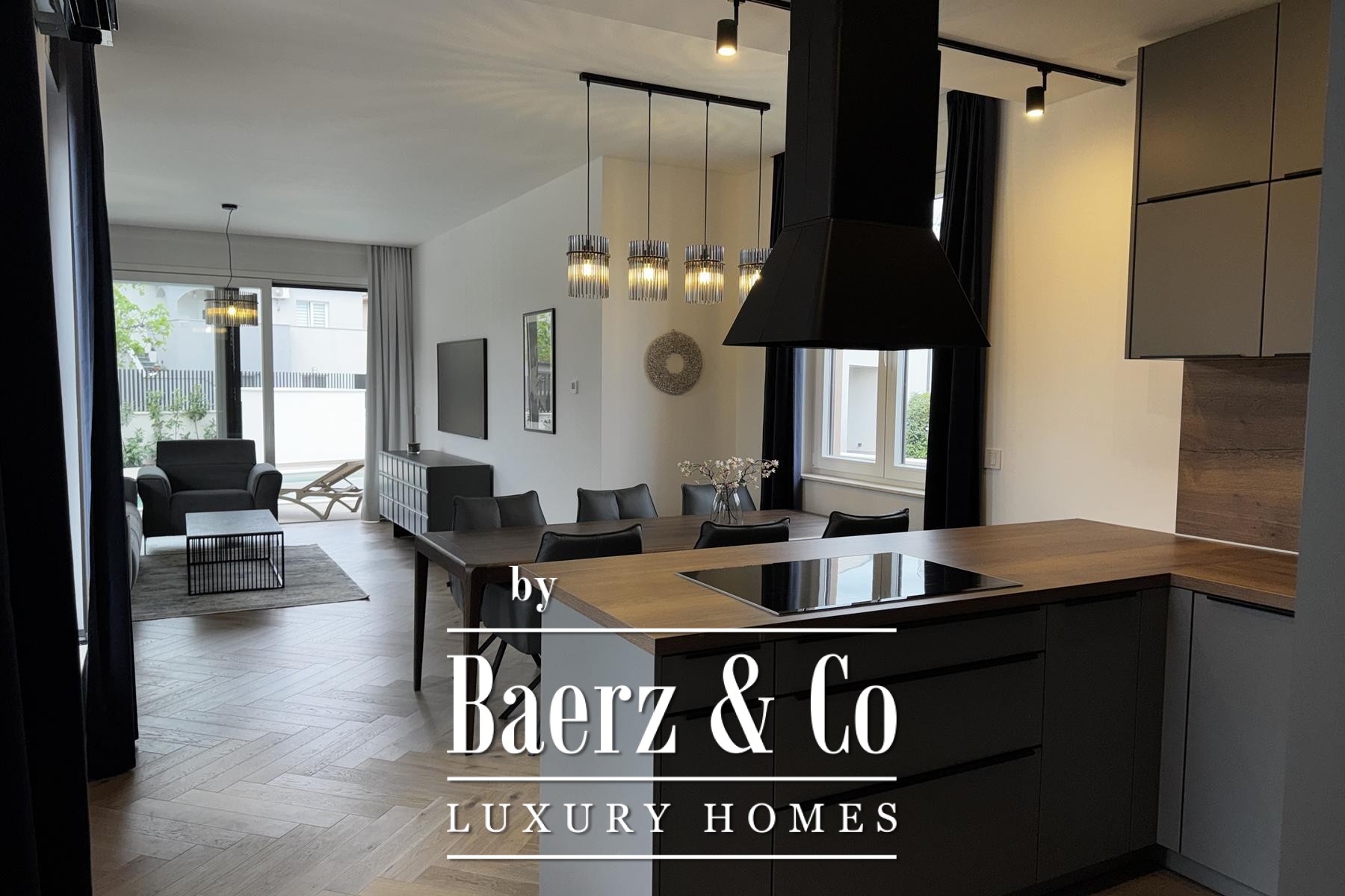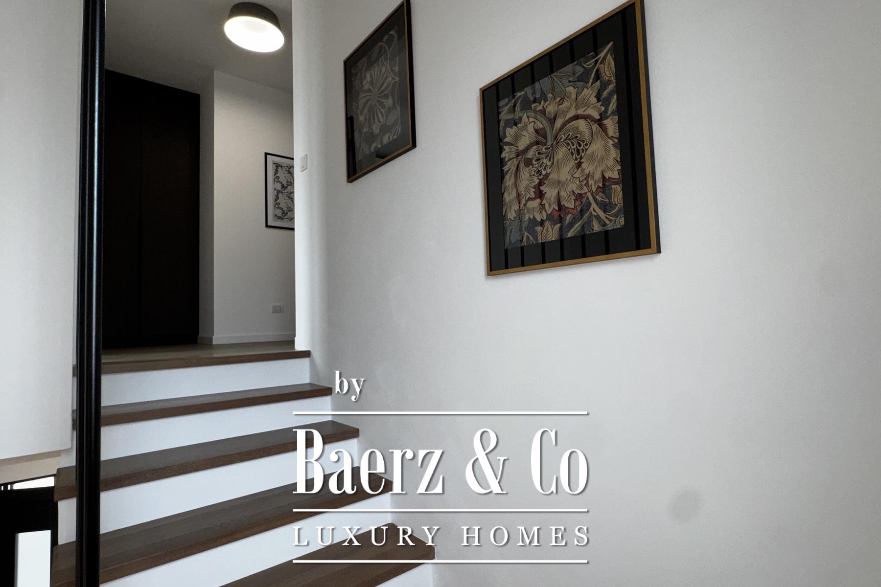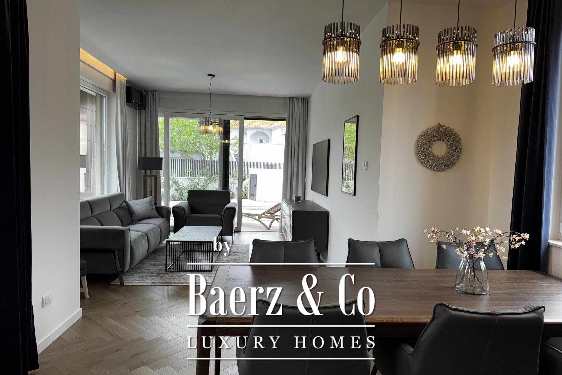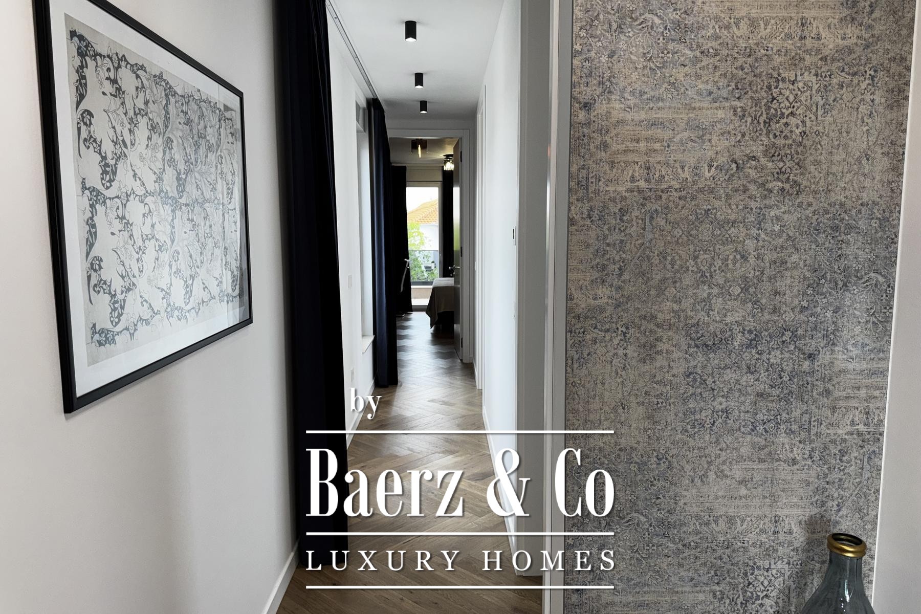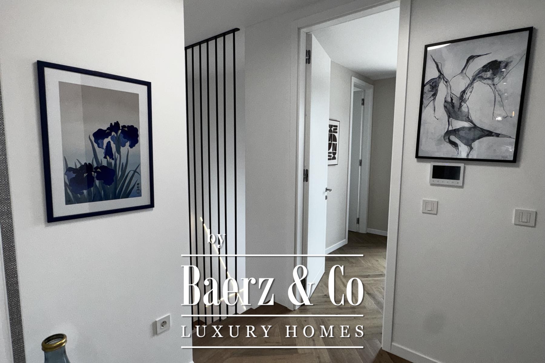 Op de eerste verdieping bevinden zich drie slaapkamers, waaronder een master suite met inloopkast en een secundaire suite met eigen badkamer en toegang tot het terras. Hierdoor ontstaat een doordachte balans tussen privacy en lichtinval. Hoogwaardige materialen, zoals drielaags parket, massief houten trappen, hoge deuren en kwaliteitsafwerking, zorgen voor een sfeer van ingetogen luxe.