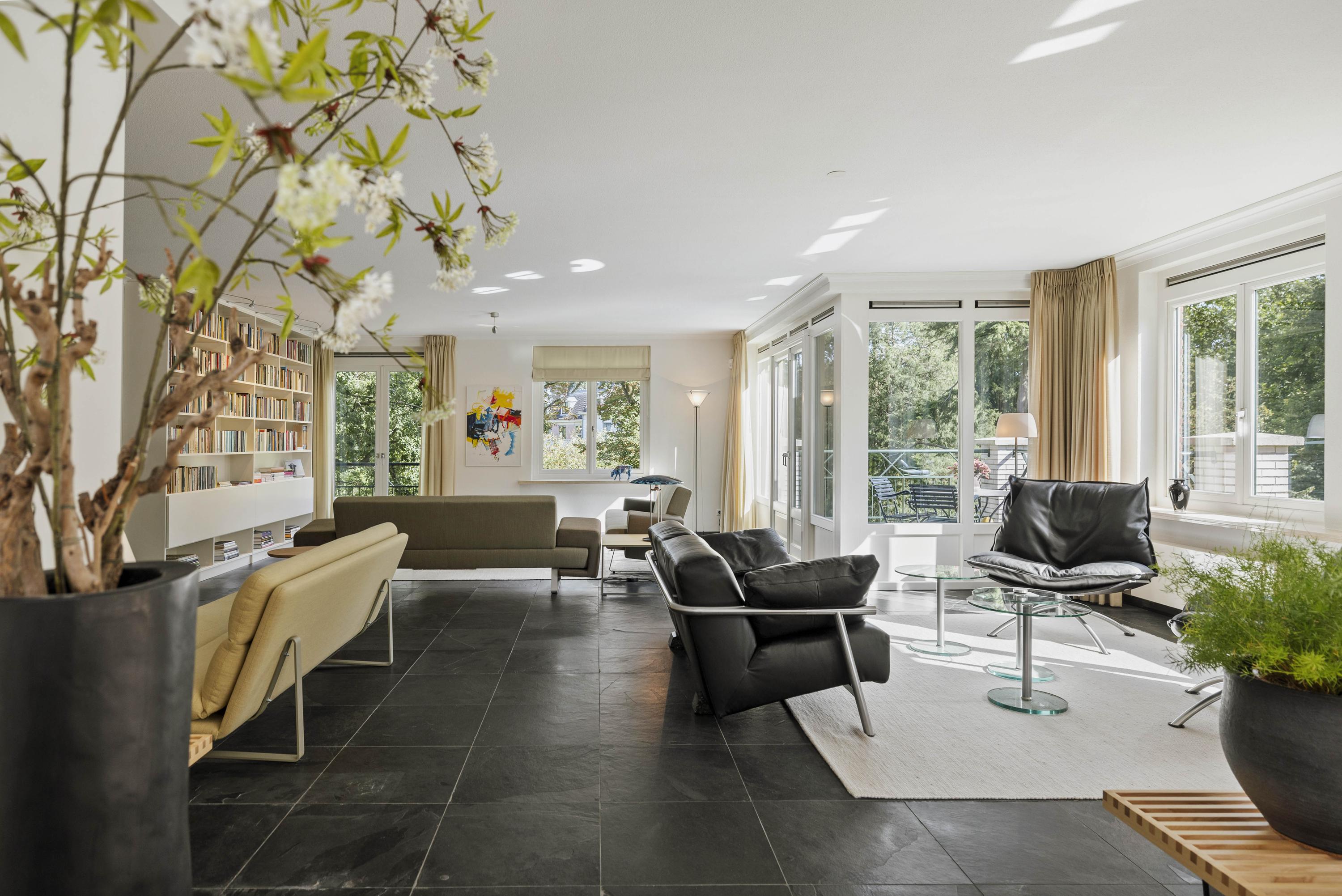 De riante woonkamer, met in het verlengde een ruime studeerkamer en-suite, biedt een prachtig uitzicht op het park en heeft openslaande deuren naar alle balkons.