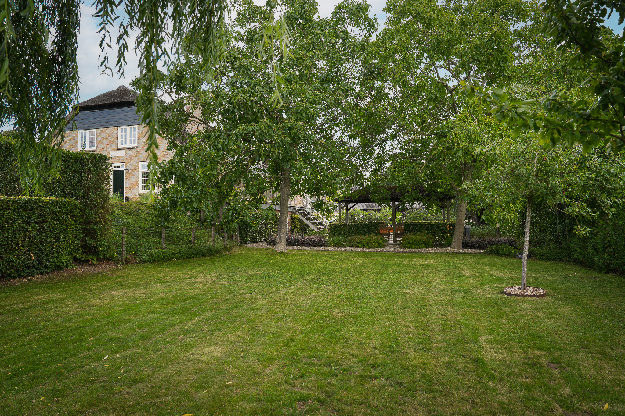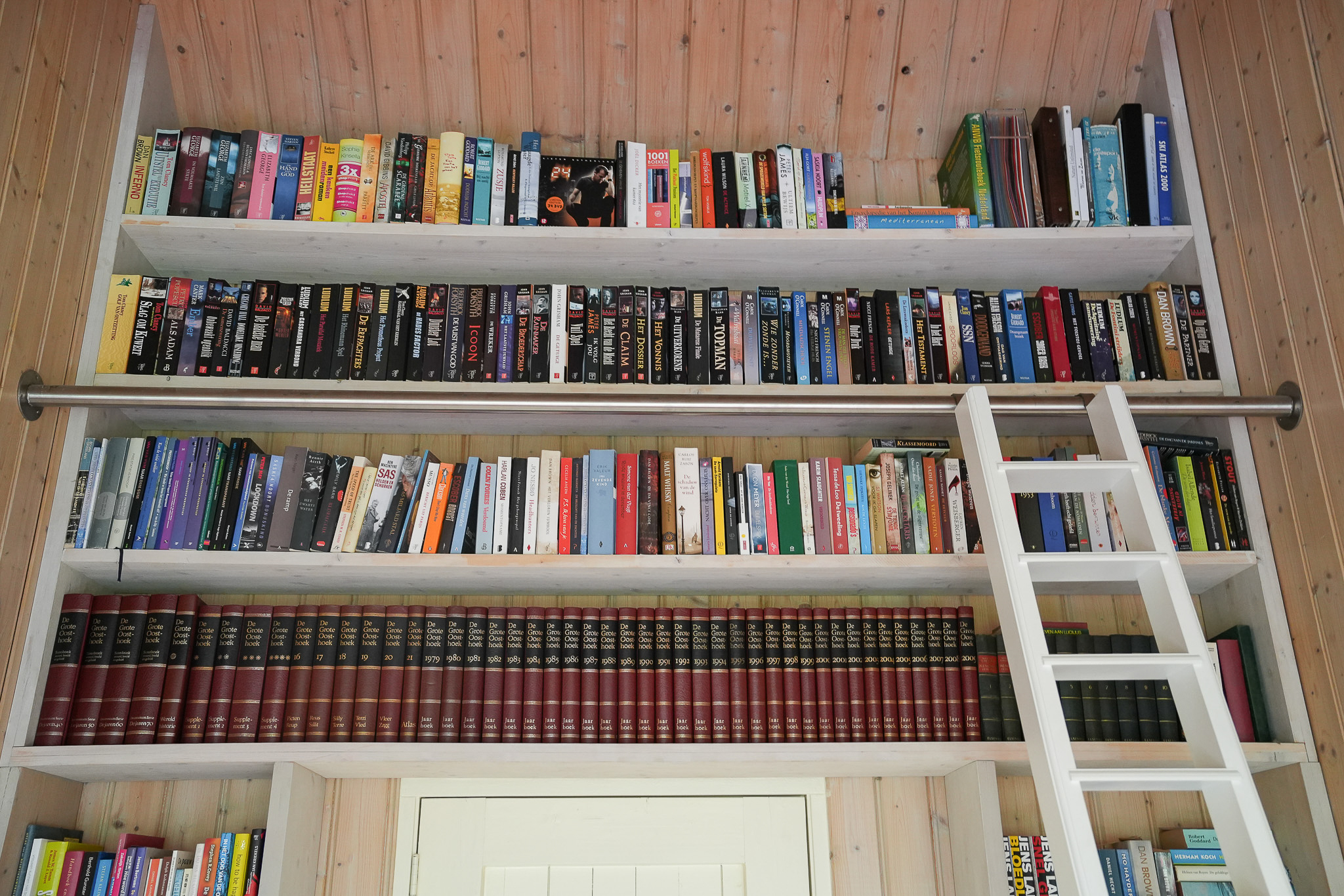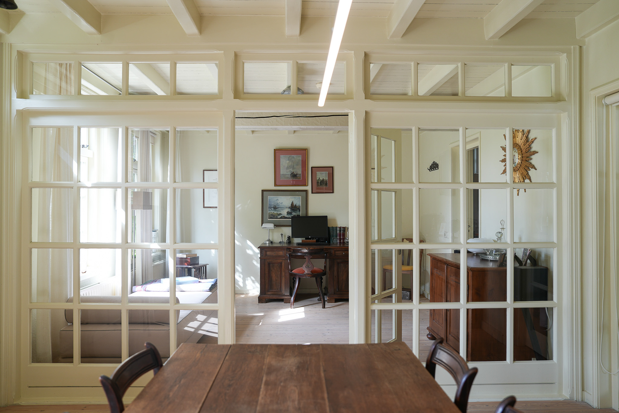 Tuingerichte leefruimte van 140 m² met brede vloerdelen, houtkachel en een compleet ingerichte keuken, portaal naar de gastenkamer met aangrenzende doucheruimte, toilet en werkkamer op de begane grond.