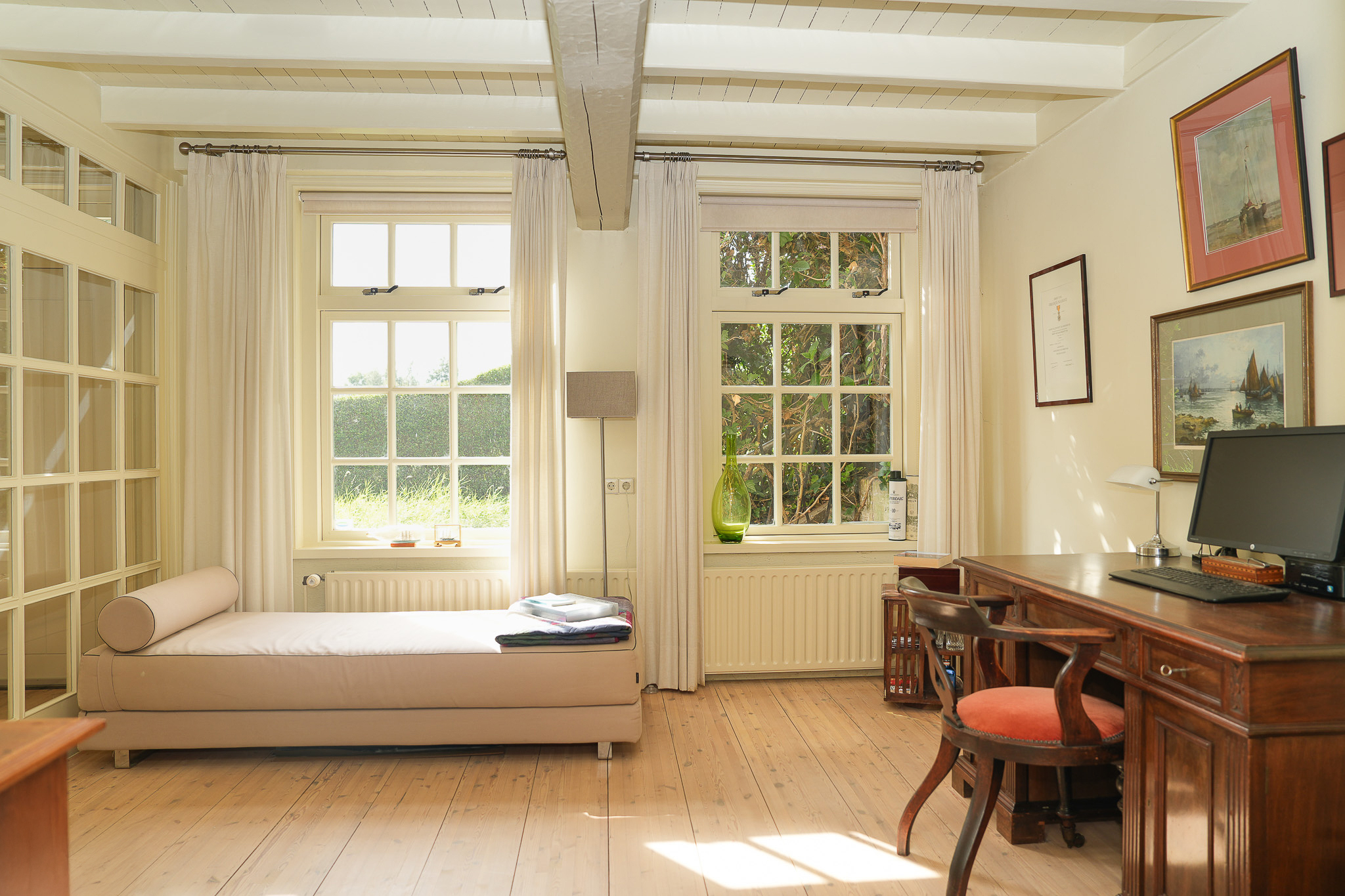De slaapkamer aan de oostzijde beslaat de volledige diepte van het huis en is voorzien van vaste kasten onder de kap. De ouderslaapkamer grenst aan een breed balkon en aan een kamer die nu in gebruik is als kleedkamer. Deze ruimte leent zich ook uitstekend als extra werkkamer of badkamer.