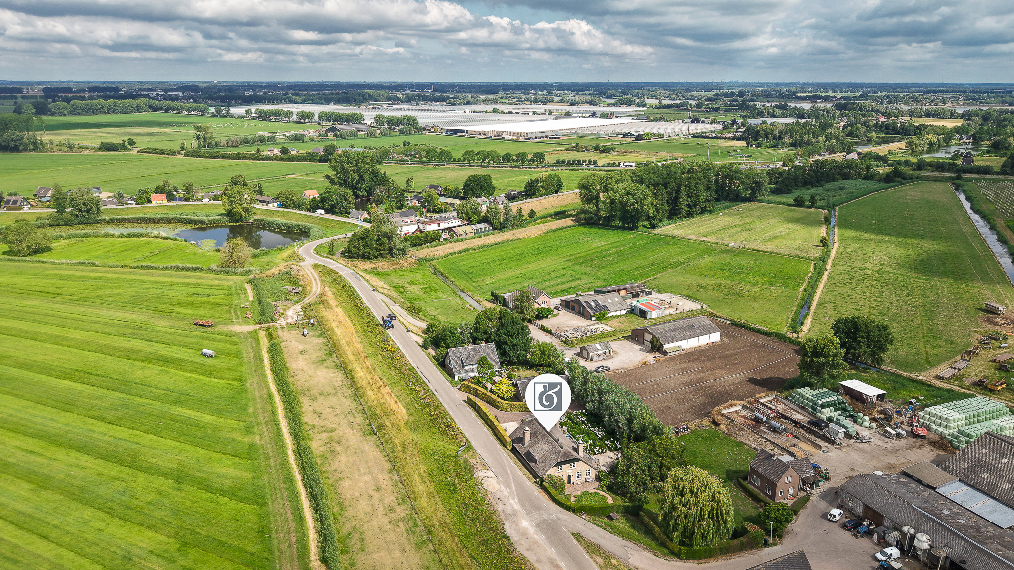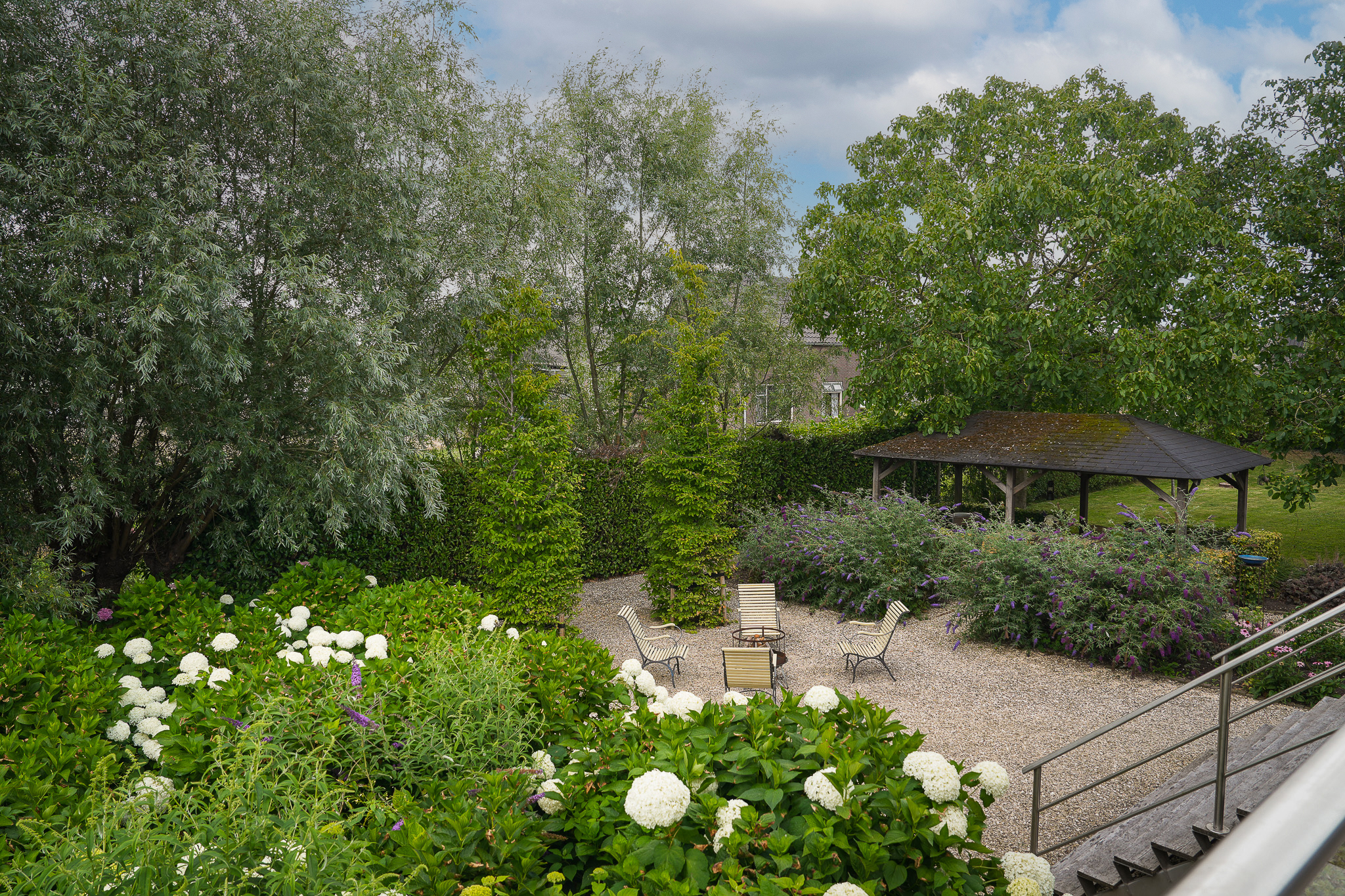Links van de oprit staat een solide pannengedekt bijgebouw met een dubbele carport, een garage en een motor- en fietsenberging. De tuin is onderhoudsvriendelijk aangelegd met grote hardhouten terrassen, transparante RVS-balustrades, sierlijke hortensiaborders en een gazon met volwassen beplanting. Het talud langs de dijk is ingeplant met onder andere maagdenpalm en goudaardbei. Het dak van het bijgebouw leent zich door de oost/west-oriëntatie bij uitstek voor het plaatsen van zonnepanelen. Bij plaatsing van ten minste 4 zonnenpanelen, gaat het huidige energielabel C naar B.